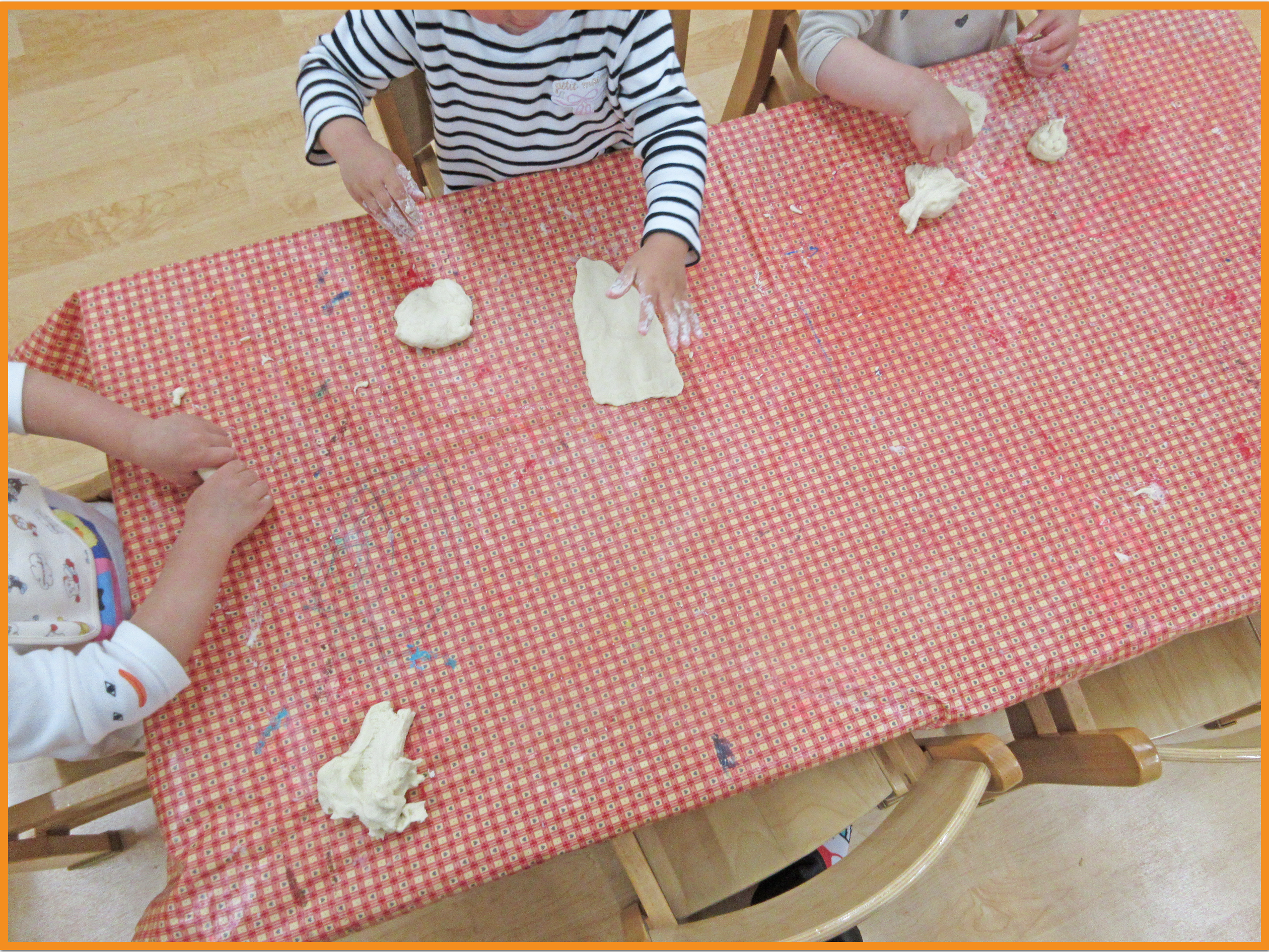 小麦粉粘土を渡すと、「餅みたいだね」「冷た~い!」と感触を言葉にしていました!