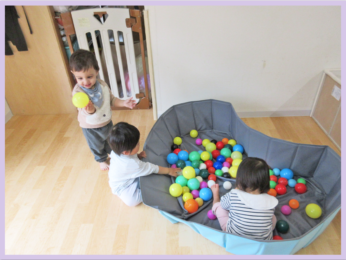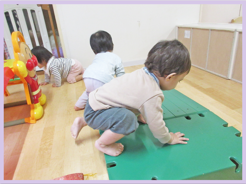 滑り台、ボール遊び、巧技台等々活動を少しずつ変えていきながら、体を沢山動かして過ごしました。一人が遊び始めると真似っこして遊び始める姿が、この時期の一歳児さんらしい可愛いい姿ですね。