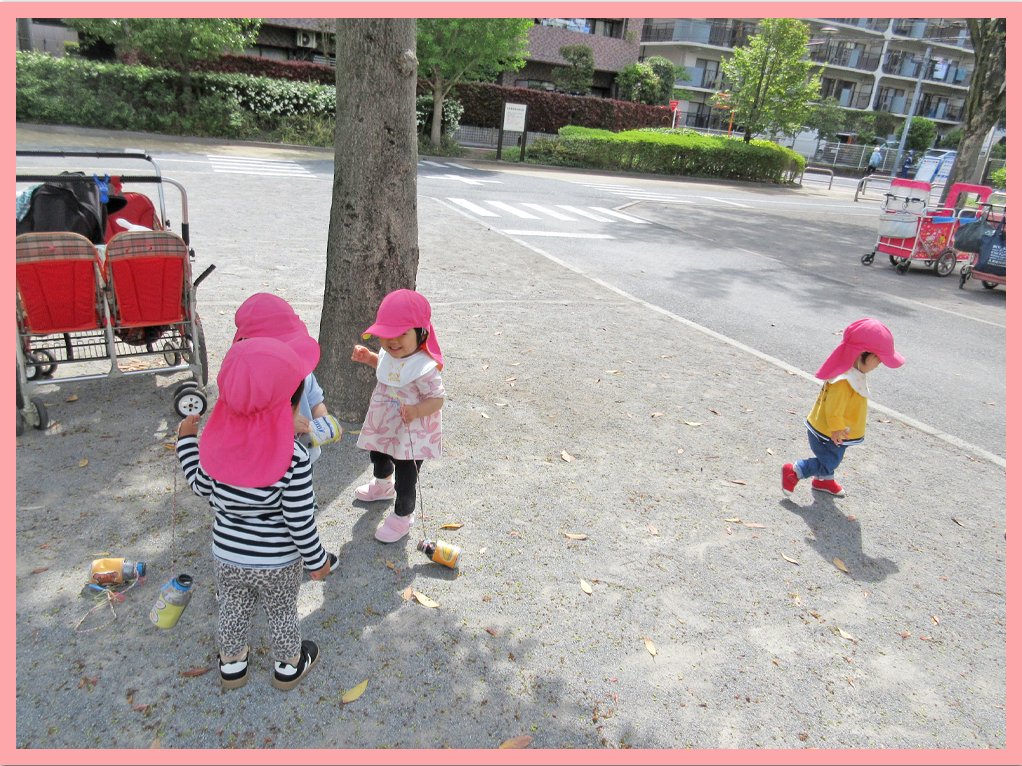 あひる組さんは今自分で歩くことが楽しい!と感じている子が多く、公園内でもバランスをとりながら一生懸命歩いてくれています。その中で引きずるとガラガラと音が出るおもちゃが楽しいようで一生懸命歩く子や、歩くのが既に上手な子は走って音が出る音を大きくし、それぞれの楽しみ方を楽しんでいました。道端を見るとタンポポが沢山咲いており、今日はその中で綿毛を拾って皆で探索しました。保育者がふーっと息をかけると飛んでく綿毛に驚きを見せてくれる顔がとてもかわいらしかったです。