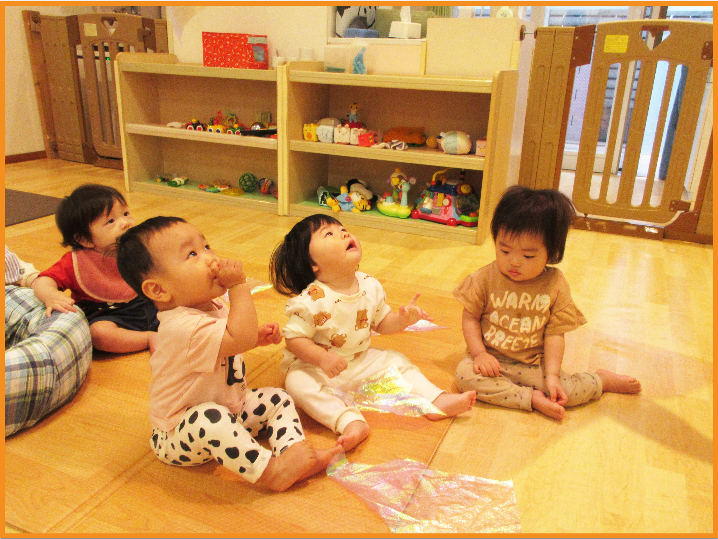 保育者が大きく切った紙でみんなを仰ぐと、きらきら光る様子にくぎ付けになったり、一人ひとり持てるよう小さく切った紙に興味津々な様子が見られたりしました。