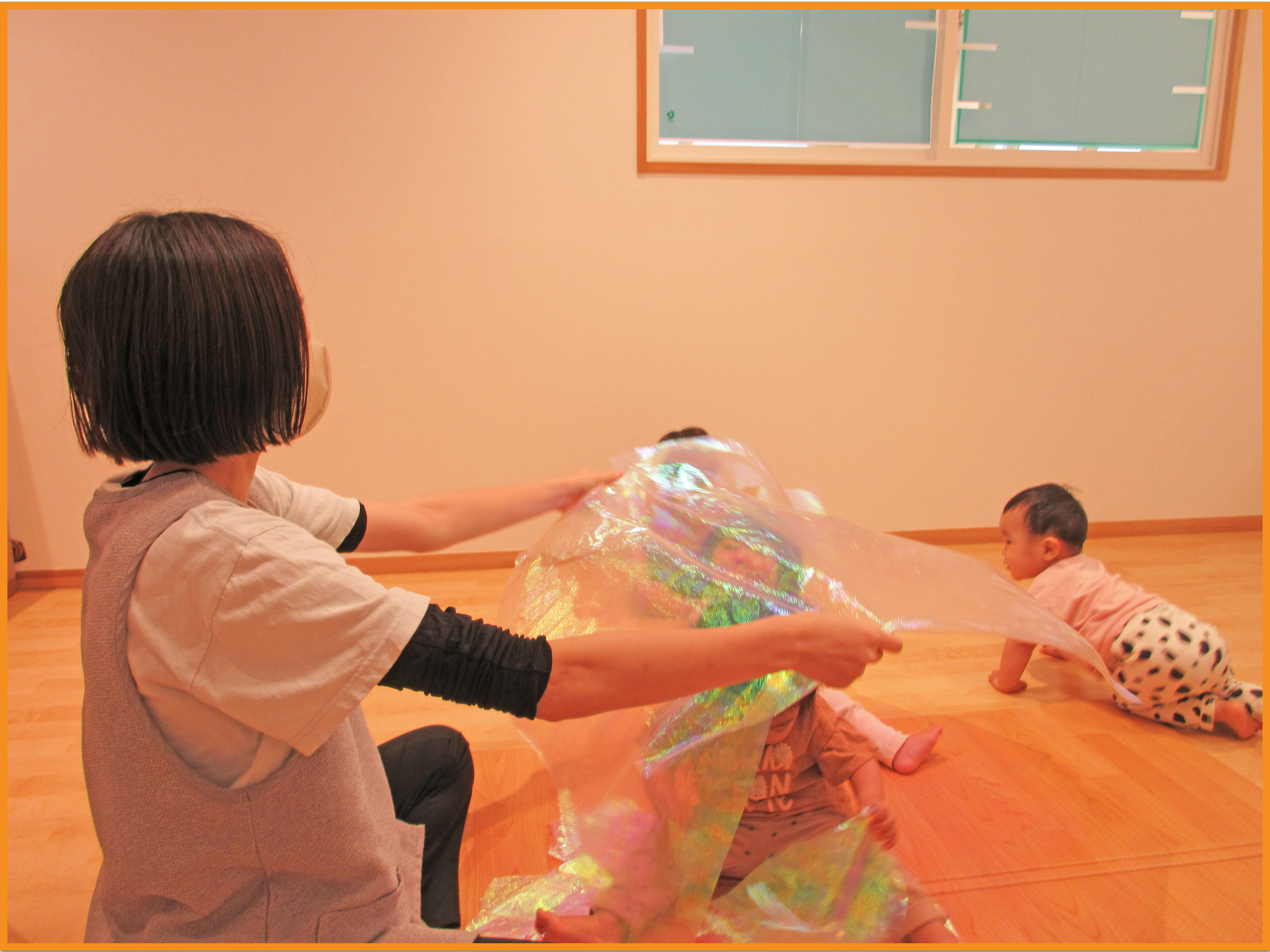 大きな紙の上に座ったり寝転んだりして全身で感触や音を楽しんでいました。