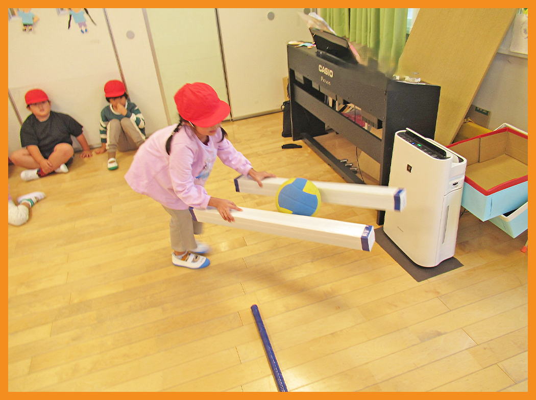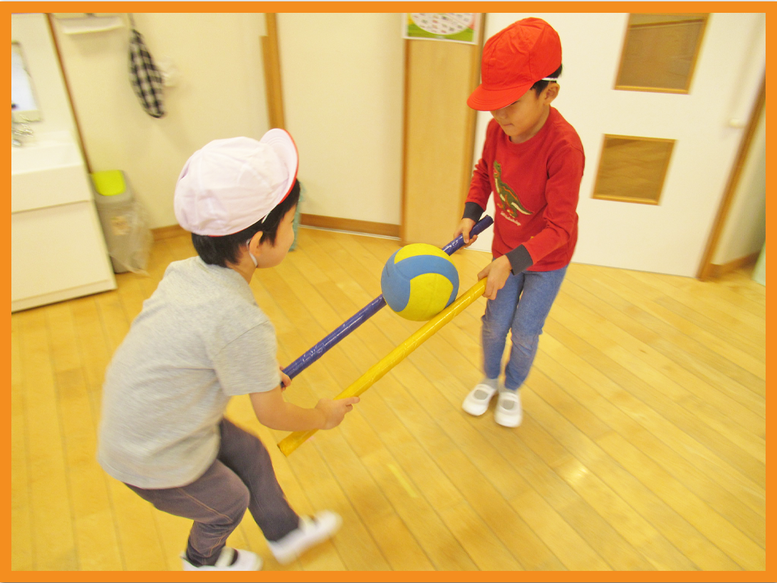 次に、細い棒を使って運びます。細くなるだけで難しく、落としたりボールがユラユラ揺れたりしてなかなかゴールまで行きませんでした。そんな時に「もっと息合わせて」「棒を離しすぎないように」と、どうしたら上手く運べるかを話し合う姿も見られました。