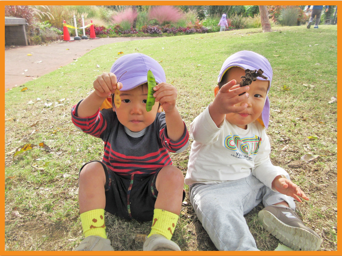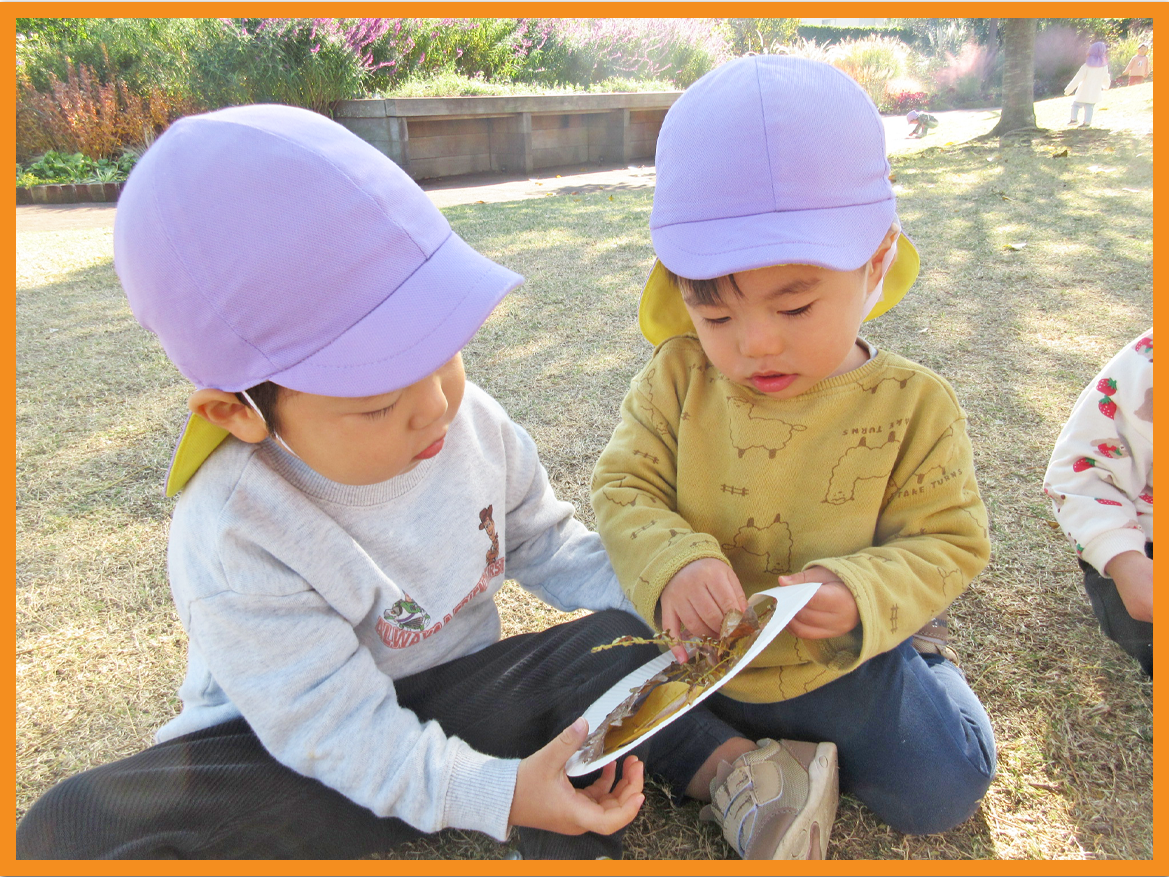 公園では探索活動を中心に保育者や友だちと一緒に落ち葉やどんぐり拾いなど秋の自然に触れながら遊ぶ事を楽しんでいます。