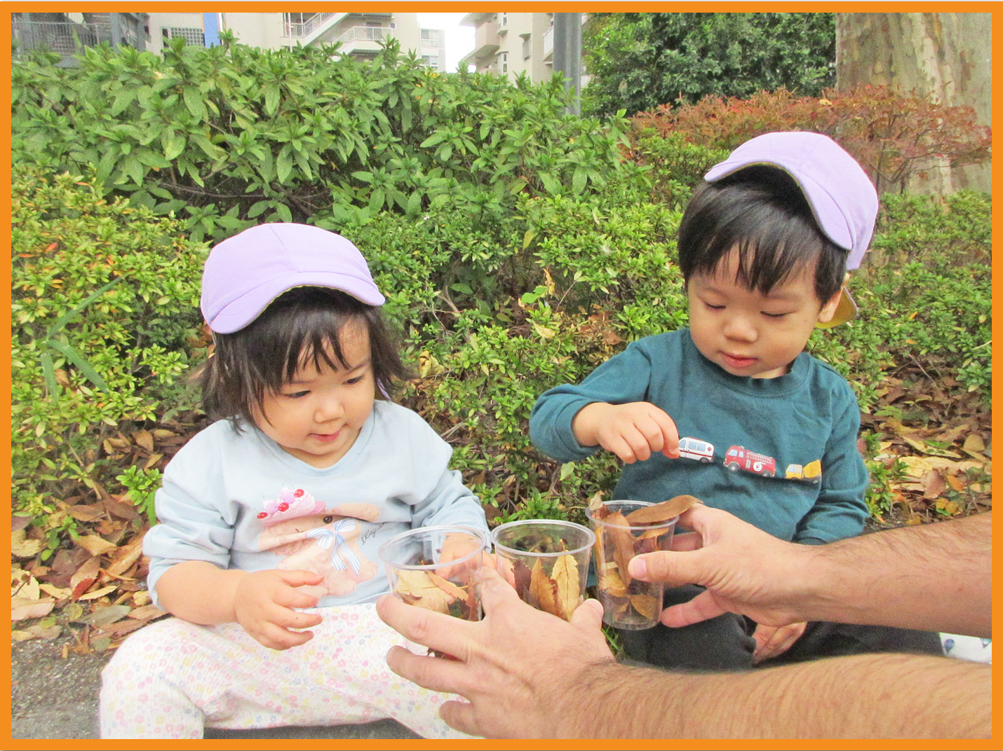 どんぐりや落ち葉を見つけては手一杯に持って大事そうに見せてくれる子どもたちです。沢山集めた落ち葉や木の実をテープのついた紙皿や透明カップに沢山集める事を楽しんでいます。