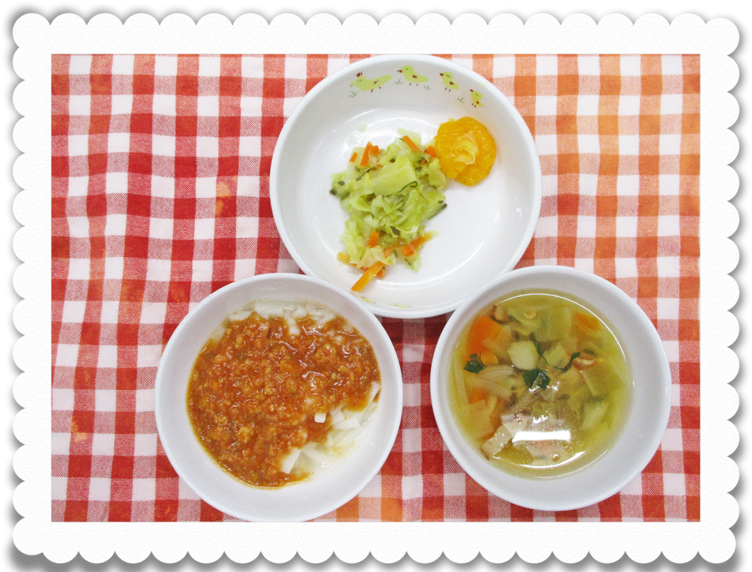 【幼児給食】スパゲティミートソース、ハワイ風サラダ、ベジタブルスープ