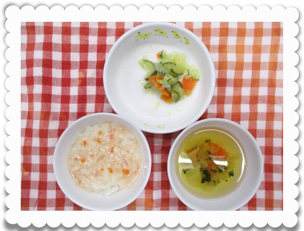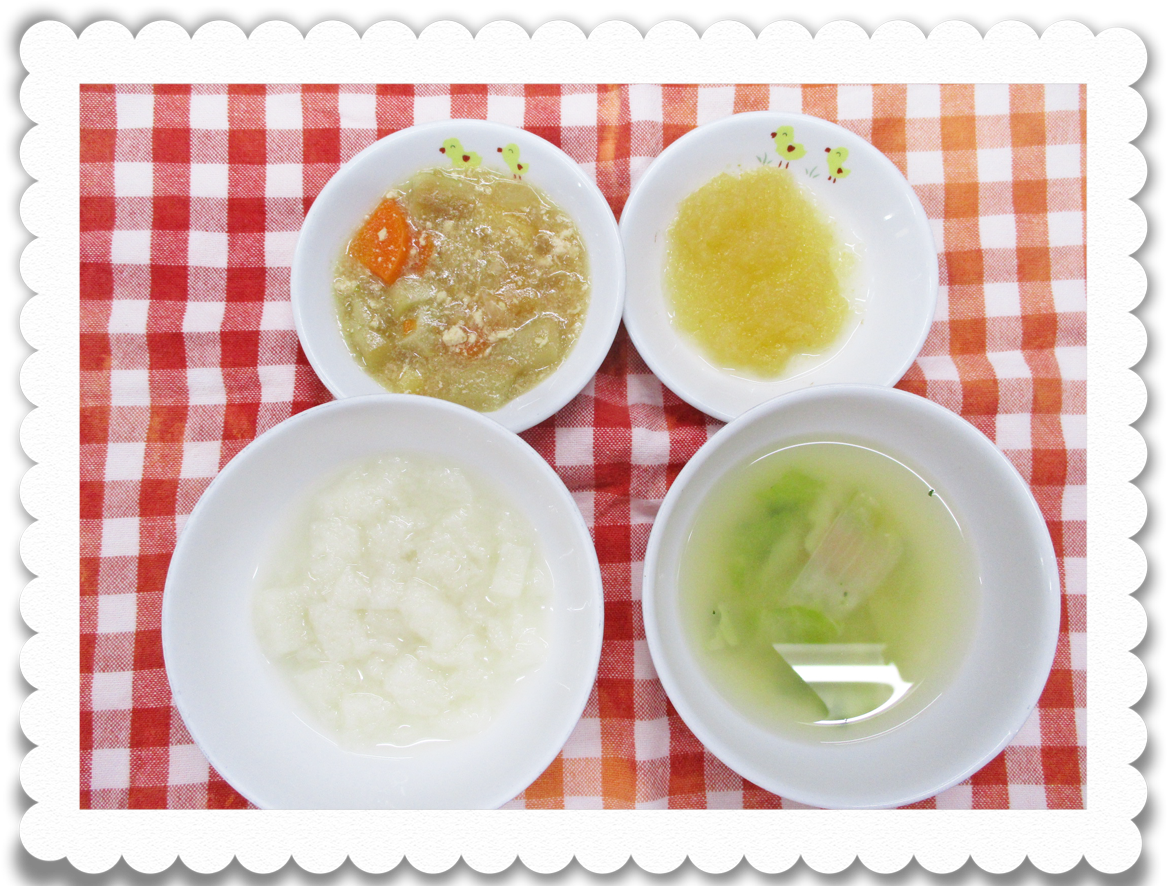 午前食:10倍粥、すり豆腐、白菜と人参のうらごし、野菜スープ
