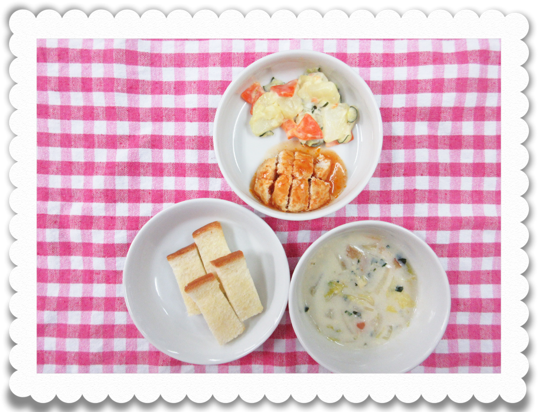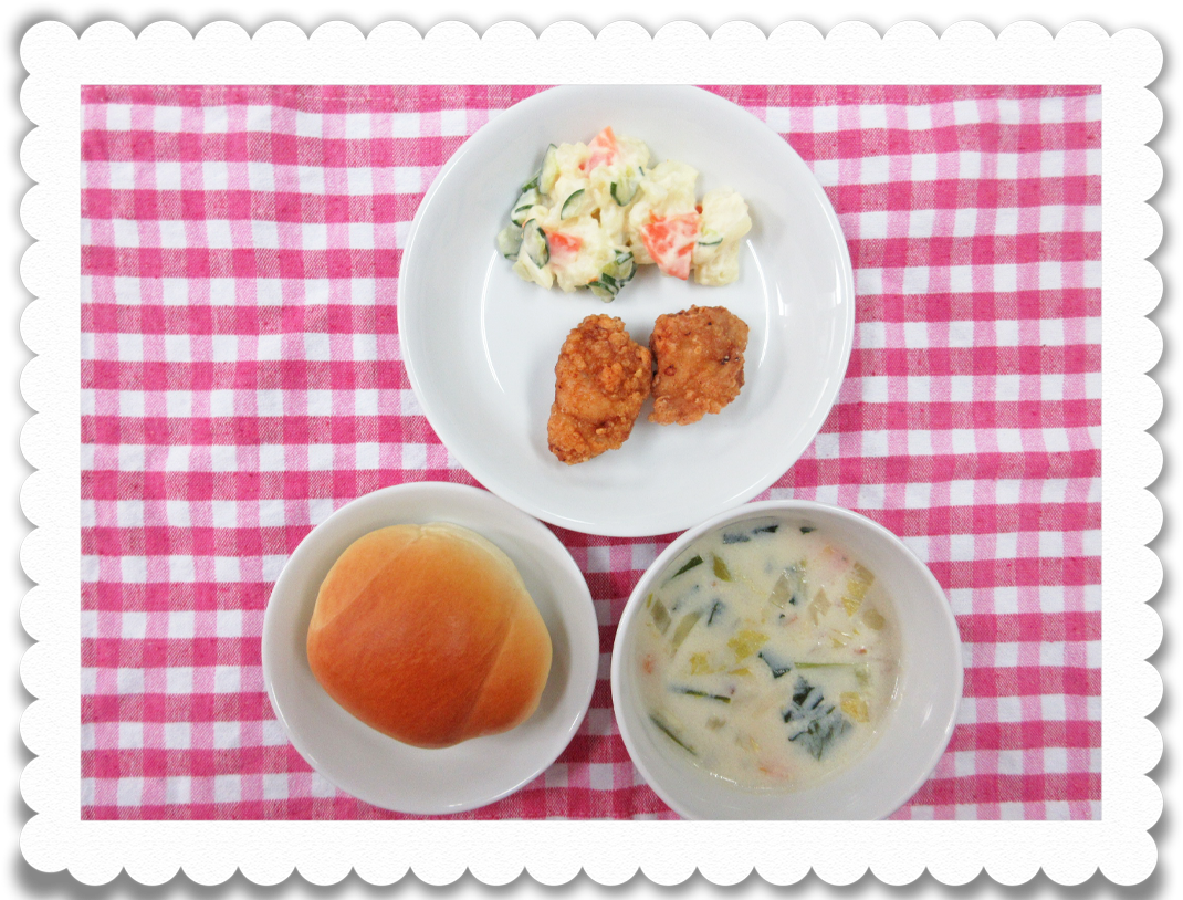 【幼児給食】バターロール、鶏の唐揚げ、ポテトサラダ、豆乳スープ