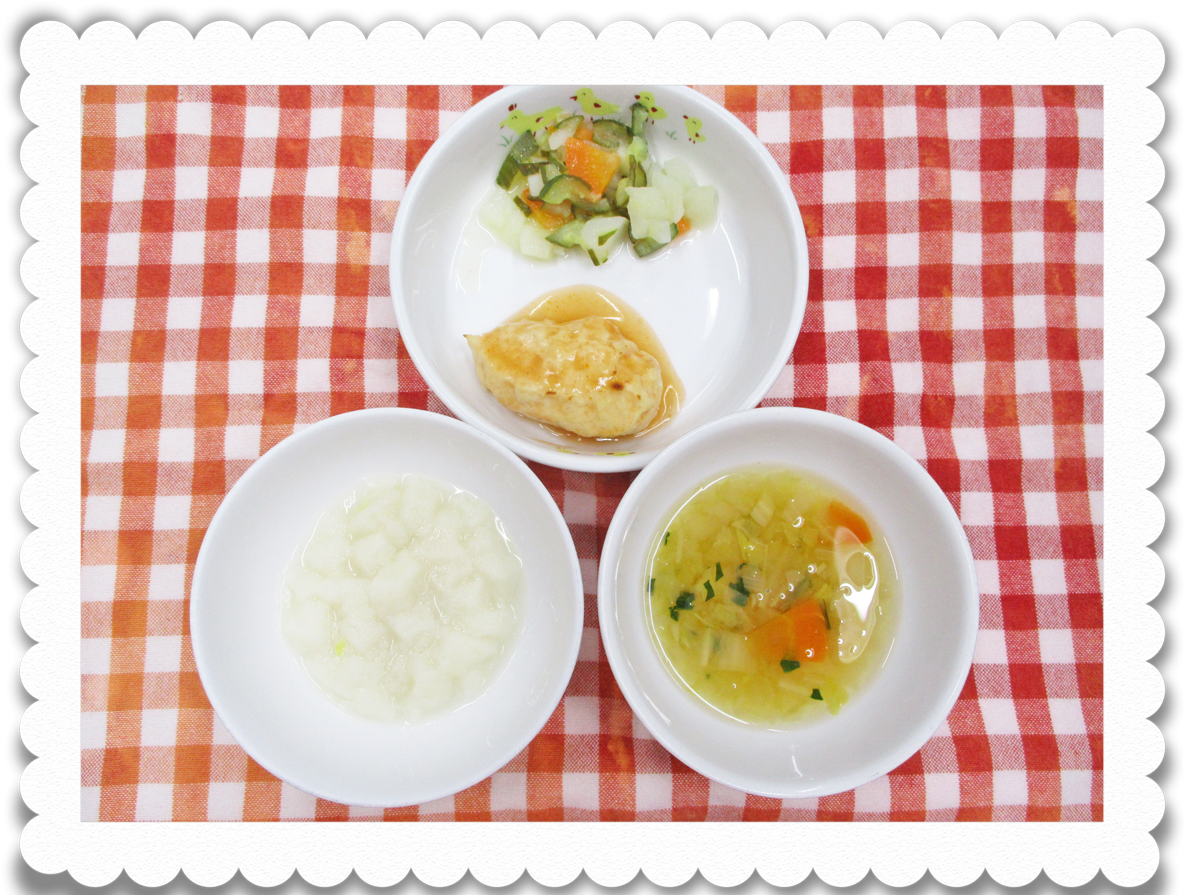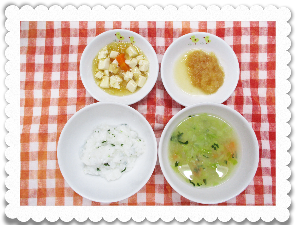 午前食:10倍粥、すり豆腐、玉ねぎと小松菜のうらごし、野菜スープ