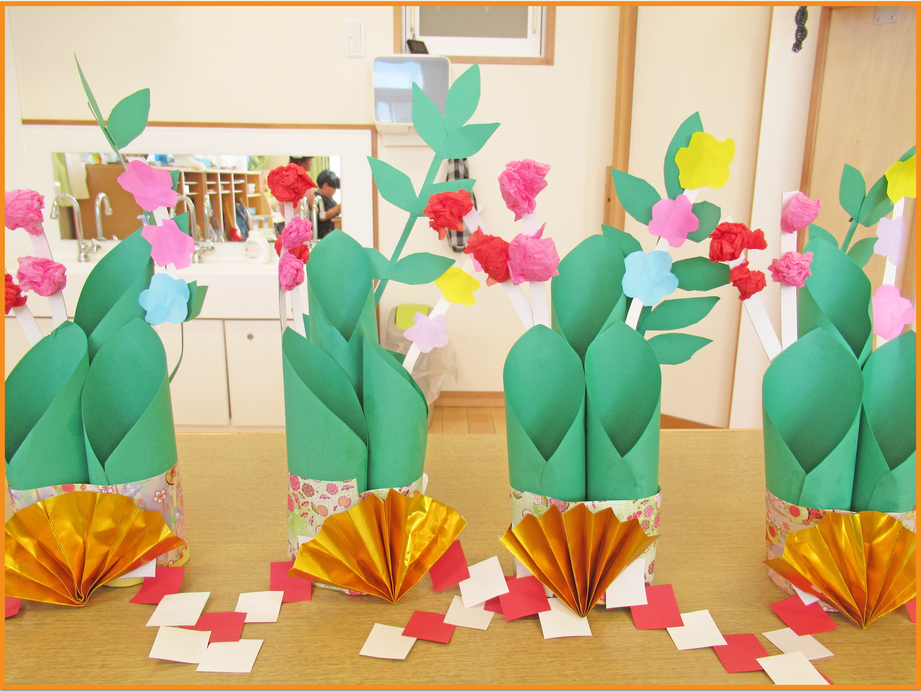 今回、たいよう組は正月の製作で「門松」を作りました。みんなでお正月の話をして色々なことを思い出す中で、「かどまつ?」とイメージが湧かなかった子も門松の写真を見ると「あっそれみたことあった」を思い出しました。