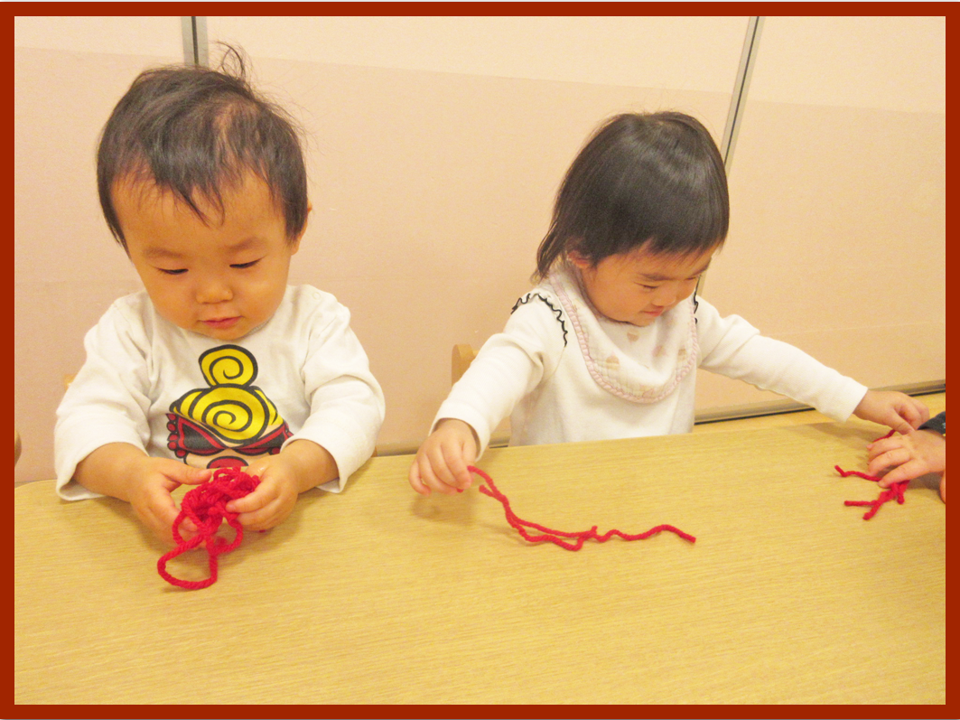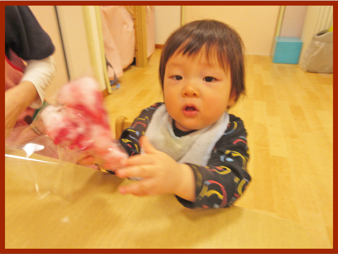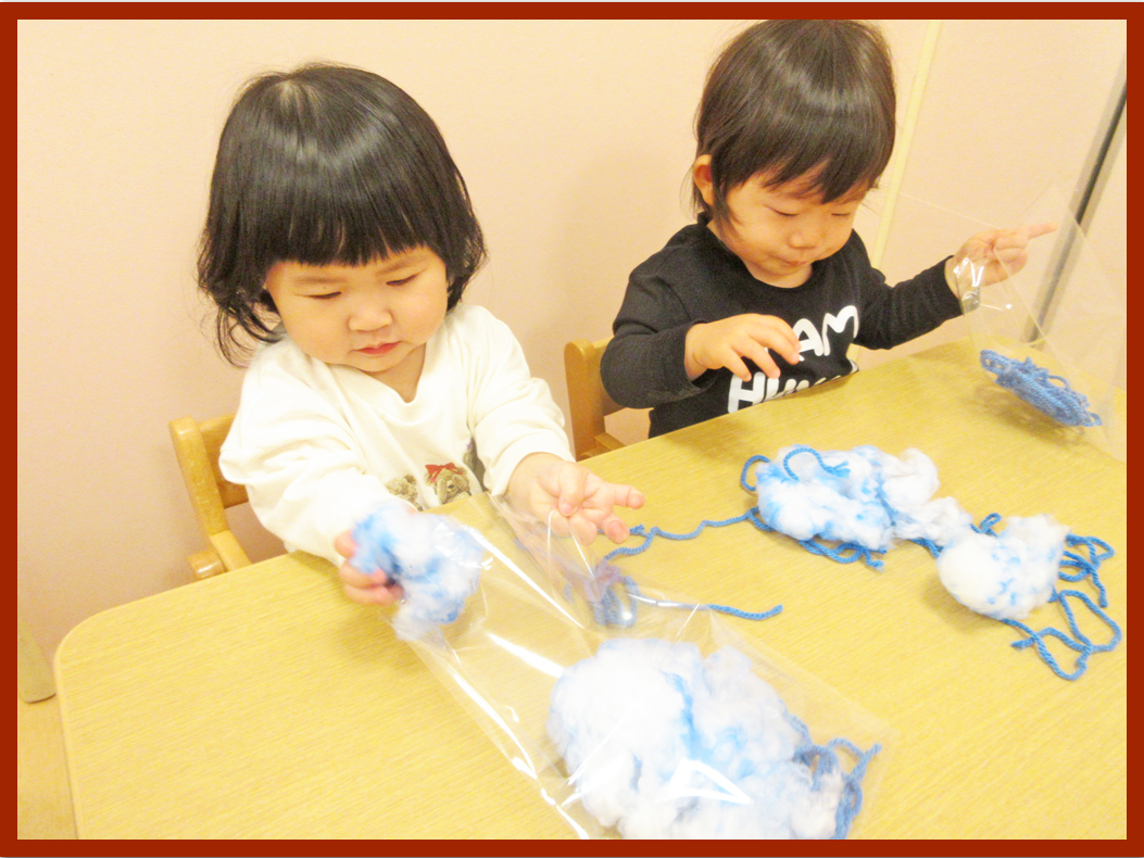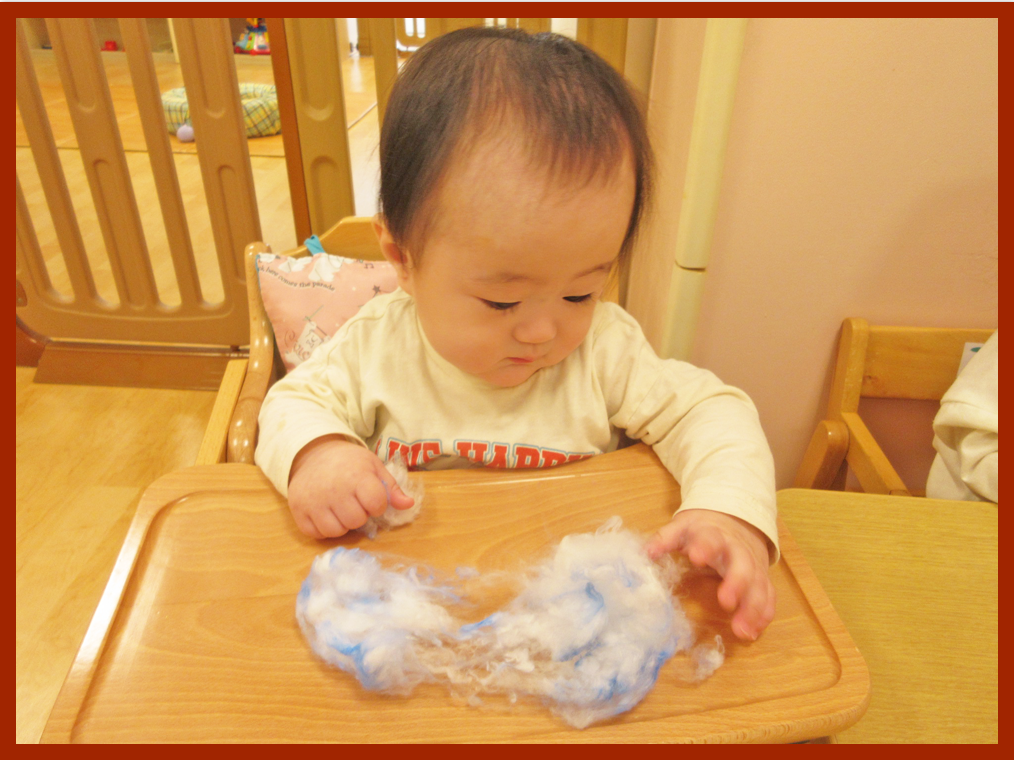 毛糸と綿を順番に渡すと初めはじっと見つめながらも保育者が触れる様子を見せていくことで、こどもたちも自分から手を伸ばし始めることができました。毛糸は丸めたり引っぱってみたりしながら感触を感じ、綿は「ふわふわだね」と話すと「ふわふわ」と真似していました。