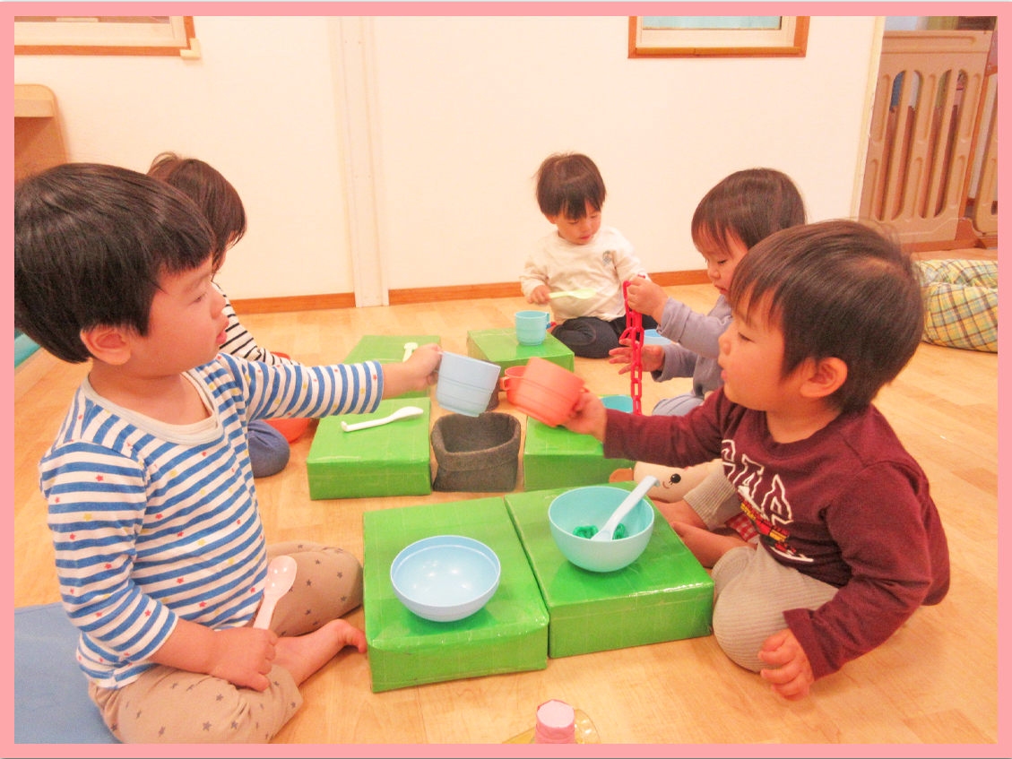 友だちと一緒に「かんぱーい」と言いながら、コップを合わせて楽しんでいます。気持が揃うと嬉しそうに笑い合っています。