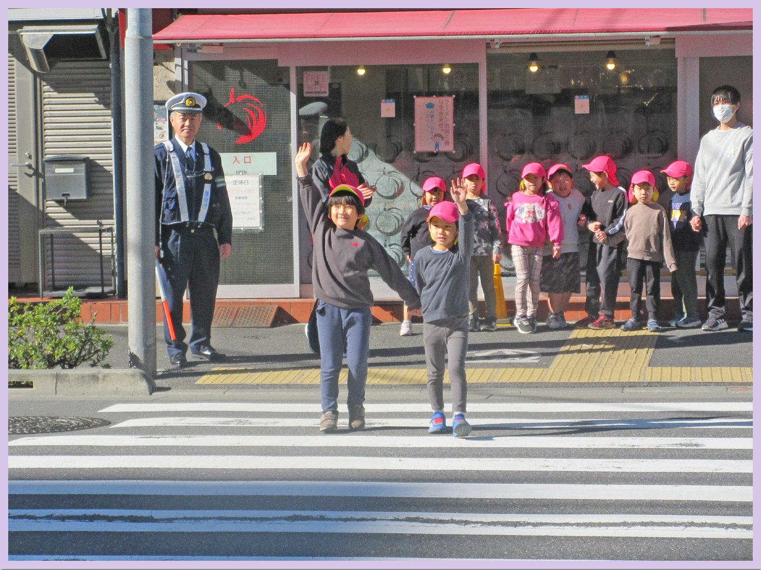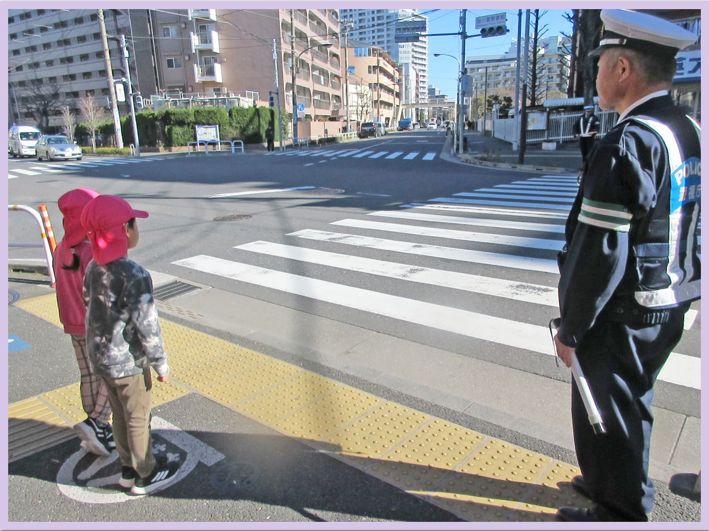 次に横断歩道の機械を使って、横断歩道の渡り方を教えてもらいました。「右、左、右」を見て、しっかり上まで手を挙げること。渡るたびに警察官の方が優しく教えてくださり、ルールを守りながら渡ることが出来ました。
