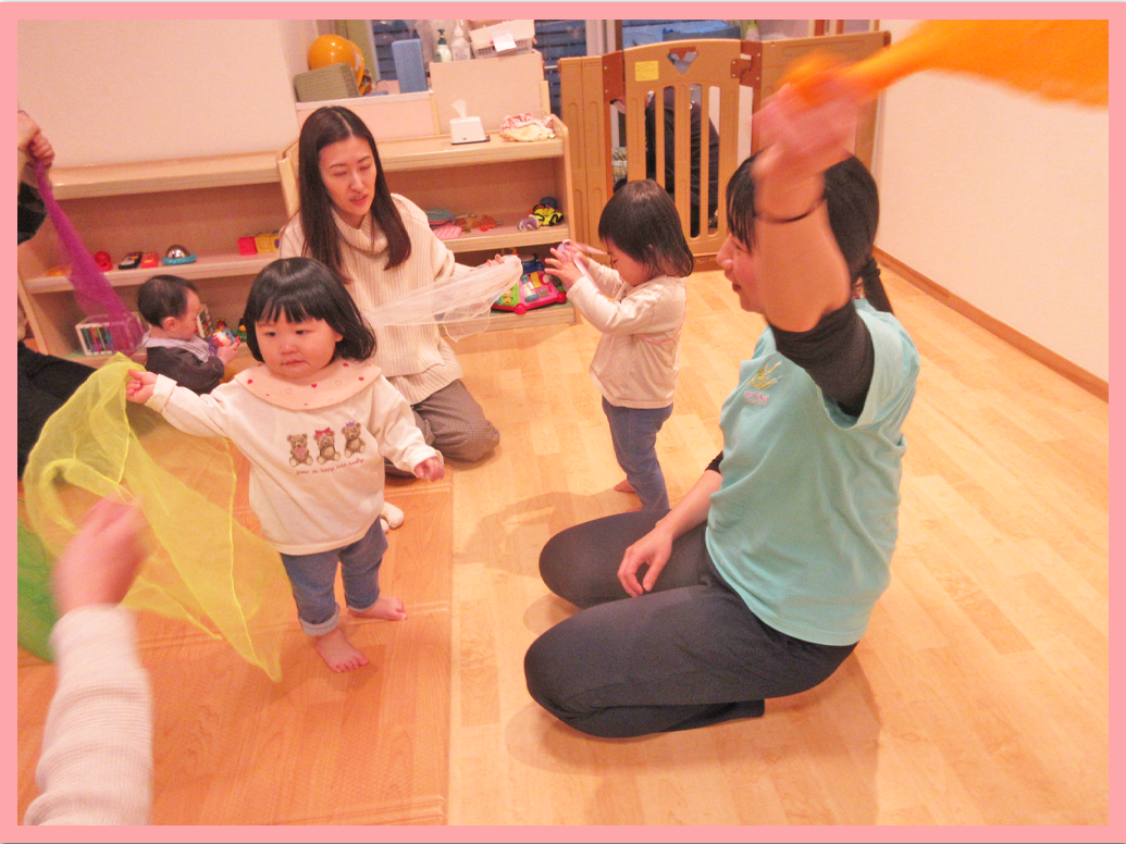 ふれあい遊びでは普段保育室で行っているふれあい遊びを保護者の方と行いました。保護者の膝をバスの席に見立ててこどもたちが座り、歌に合わせて揺れを楽しんだり、リトミックスカーフを使った遊びではスカーフがひらひら舞う様子を追いかけたりしていました。