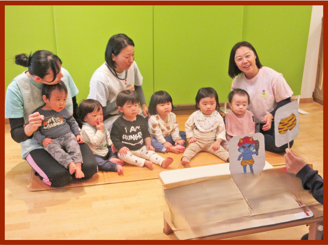 0歳児(うみ組)と1歳児(かぜ組)は、節分のペープサート(鬼のパンツ)を見ました。