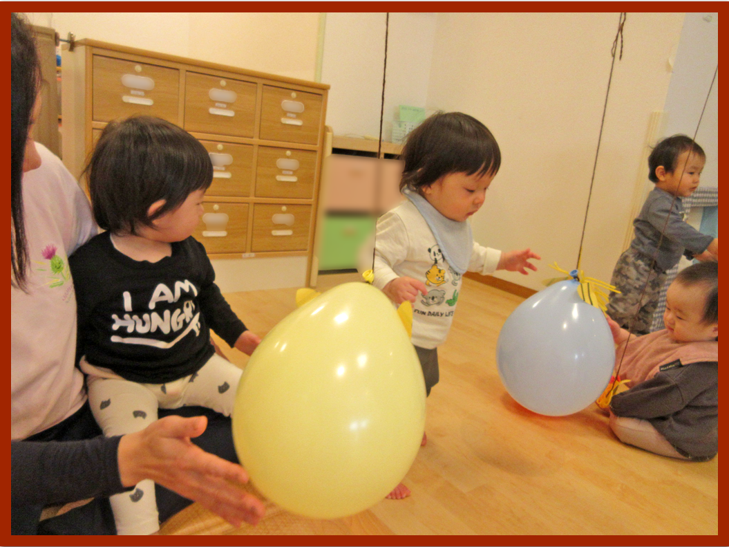 また、0歳児(うみ組)、鬼の風船に触れて遊びました。