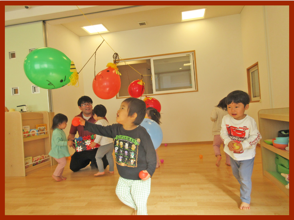 「おにはそと、ふくはうち」と言いながら、鬼の風船にボールを当てることを楽しんでいました。