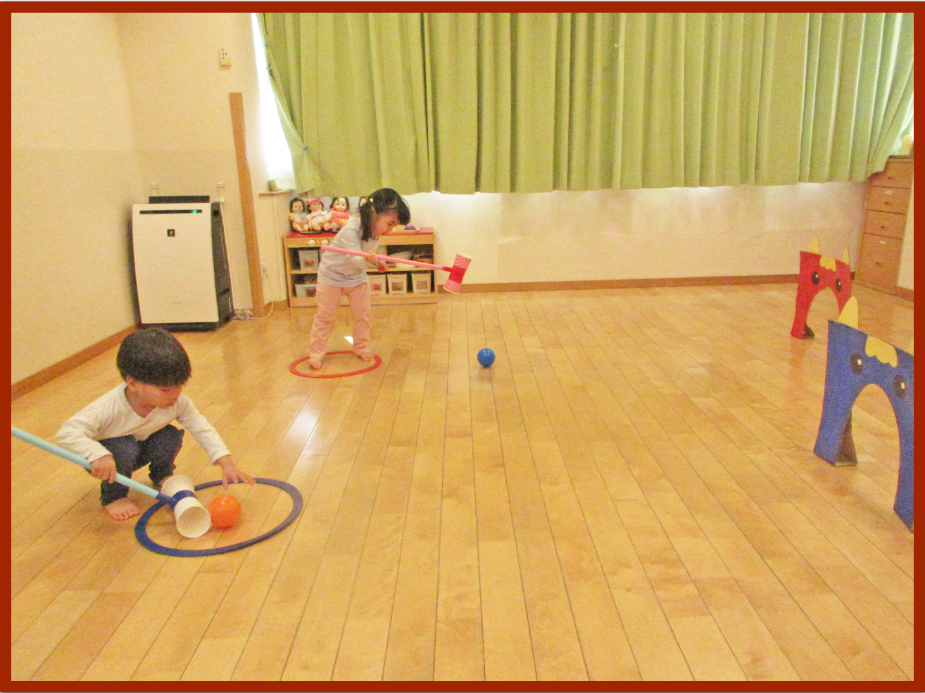 パターを使ってボールを動かし、鬼の口にボールを入れることを楽しんでいました。
