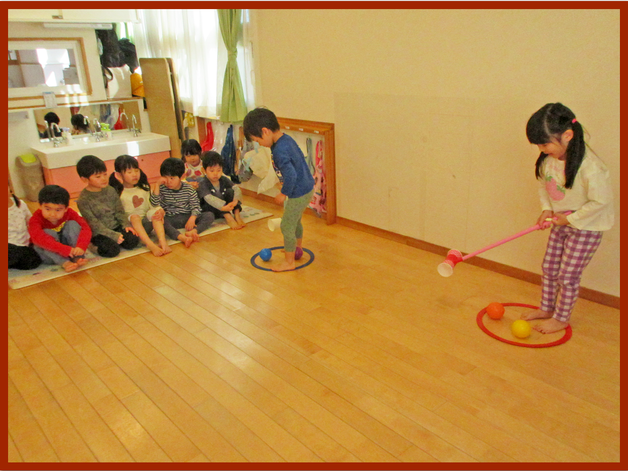 2歳児(はな組)と3歳児(もり組)は、鬼のボール入れゲームをしました。