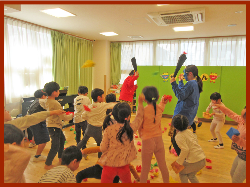 4歳児(そら組)と5歳児(たいよう組)は、鬼の格好をした保育者に豆まきをすることを楽しみました。