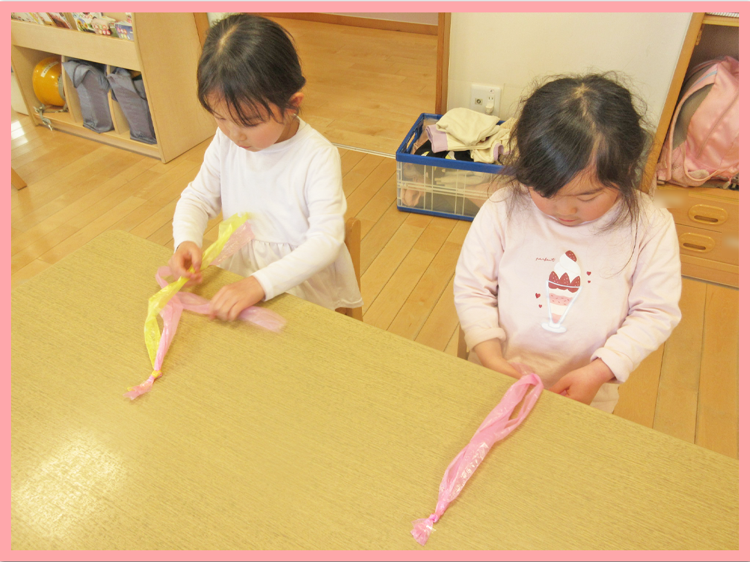保育者がスズランテープを使って、三つ編みのやり方を伝えると「順番に真ん中に持ってくるんだよ」「次はどれだっけ」と考えながら挑戦する姿がありました。
