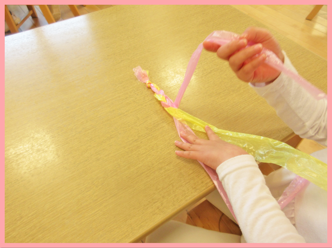 指先を上手に動かすことが出来るようになり、少しずつ紐を結んだり出来るようになってきたことで、三つ編みに興味を持つ姿が増えてきました。