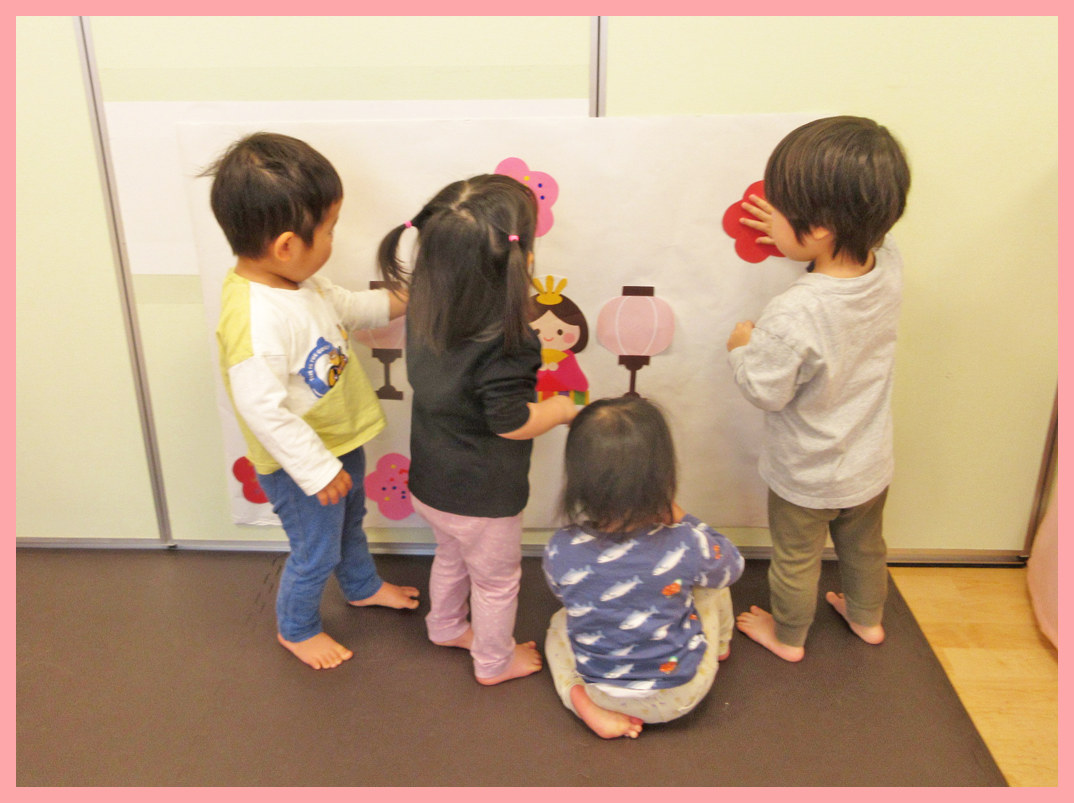 1歳児クラスは桃の花の形に切り取られた画用紙にシールやクレヨンで模様付けを行い、壁に貼ってあるお雛様とお内裏様の周りに飾り付けを行いました。