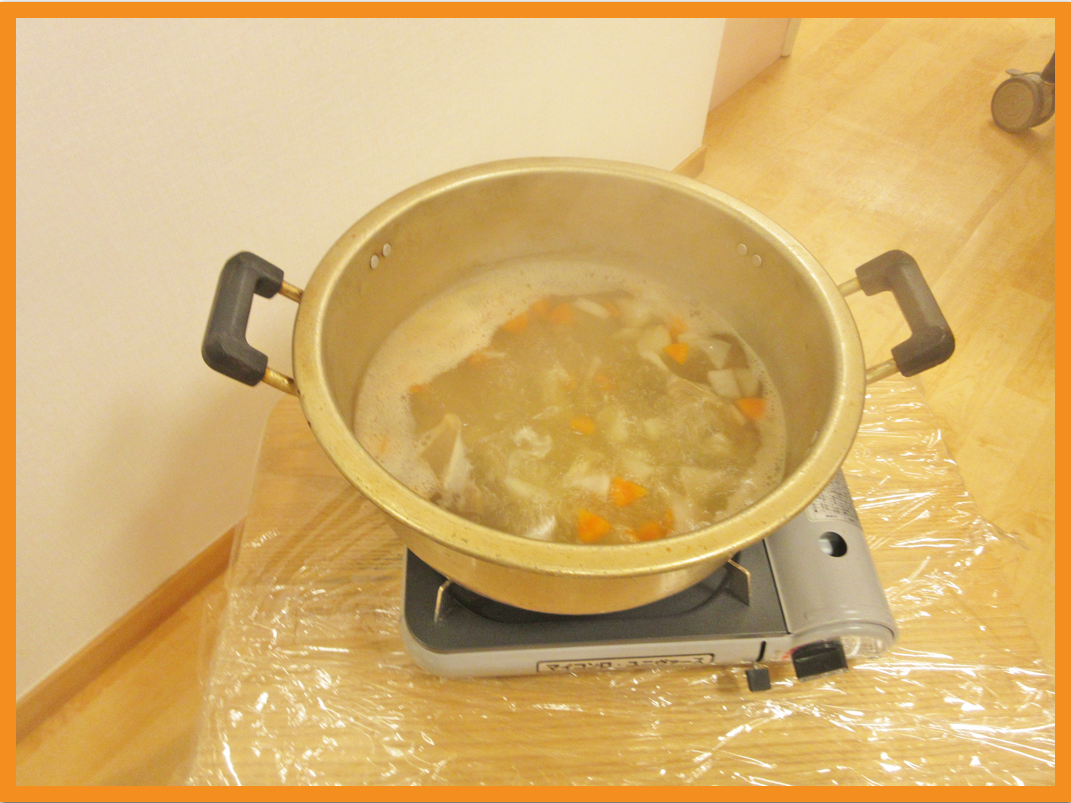 給食室で事前にだしを取っていた鍋に具材を入れました。