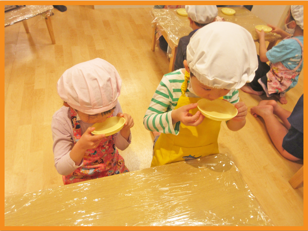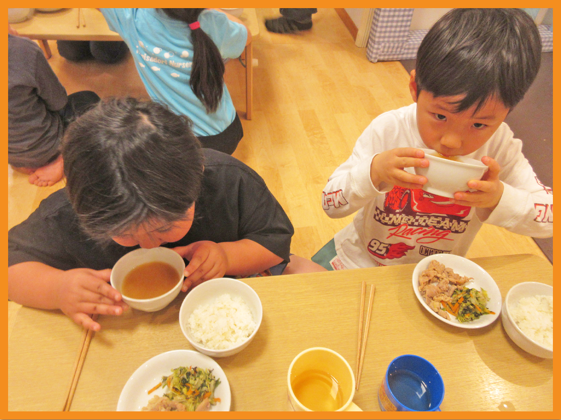 だし汁とみそをお湯で溶いた物を少しずつ味見をしてもらいました。だし汁だけだと塩味がない分少し物足りない様子でした。