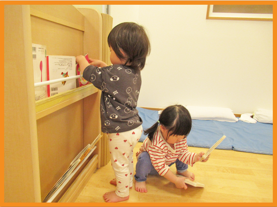 本棚から自由に読みたい本を取ったり、片づけたりしてとても楽しそうです。