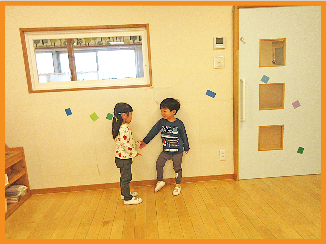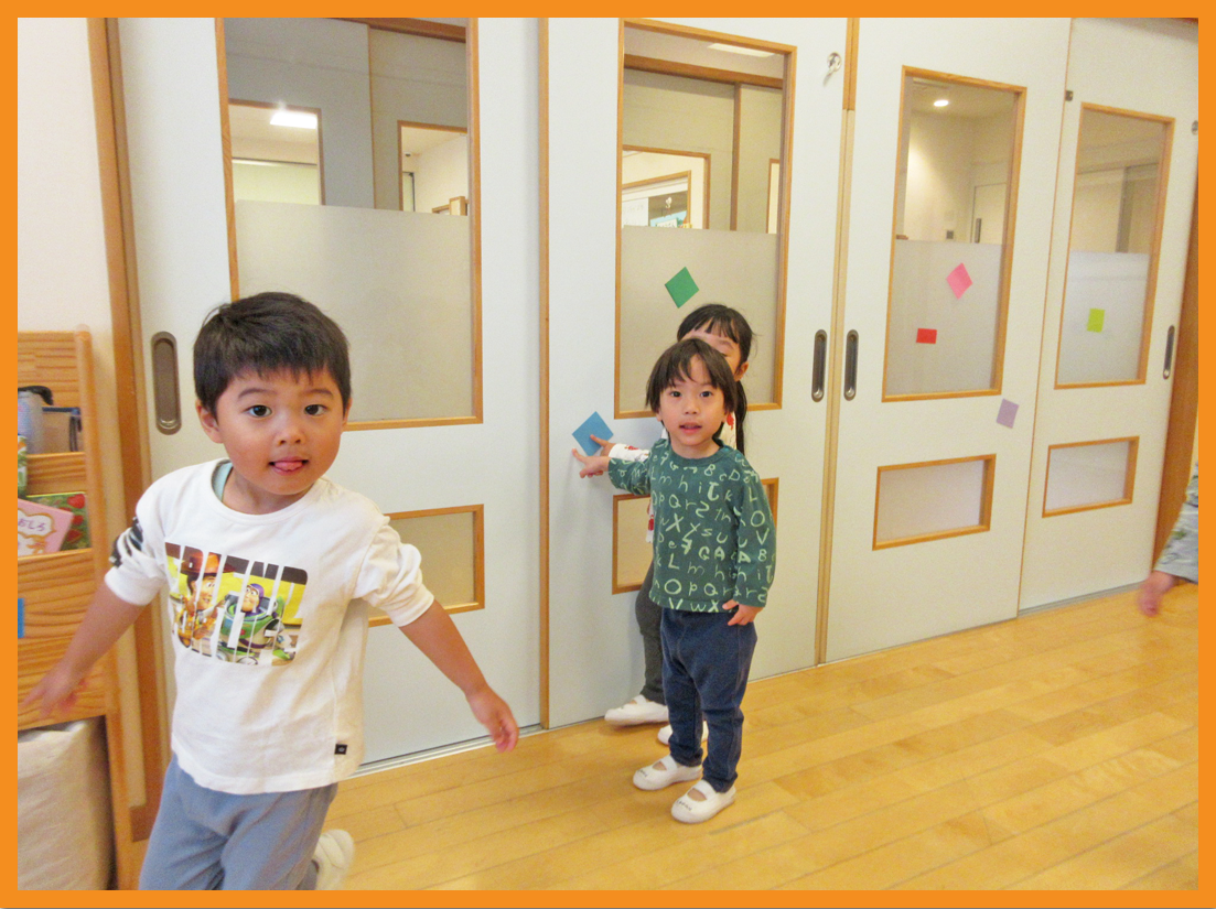 雨の日に室内でいろおにをしました。こども達と画用紙の色を確認した後、室内の壁や扉に画用紙を貼りいろおにの準備をしました。保育者が「いろおに、いろおに、○○色」と色を探す合図の言葉をいうと「どこにあるかな」「こっちかな」と言いながら色を探していました。色を見つけることができると「あった」と嬉しそうな声を出し、まだ見つけられていないお友達に「ここだよ」「あっちにもあるよ」と知らせてあげる姿も見られました。