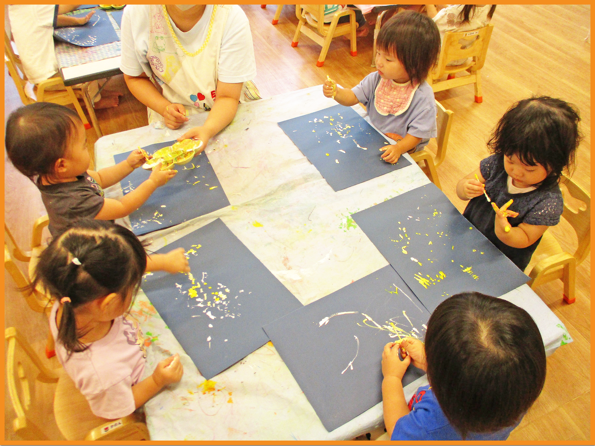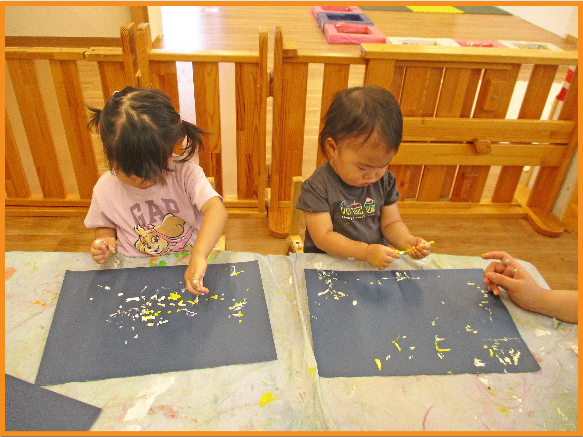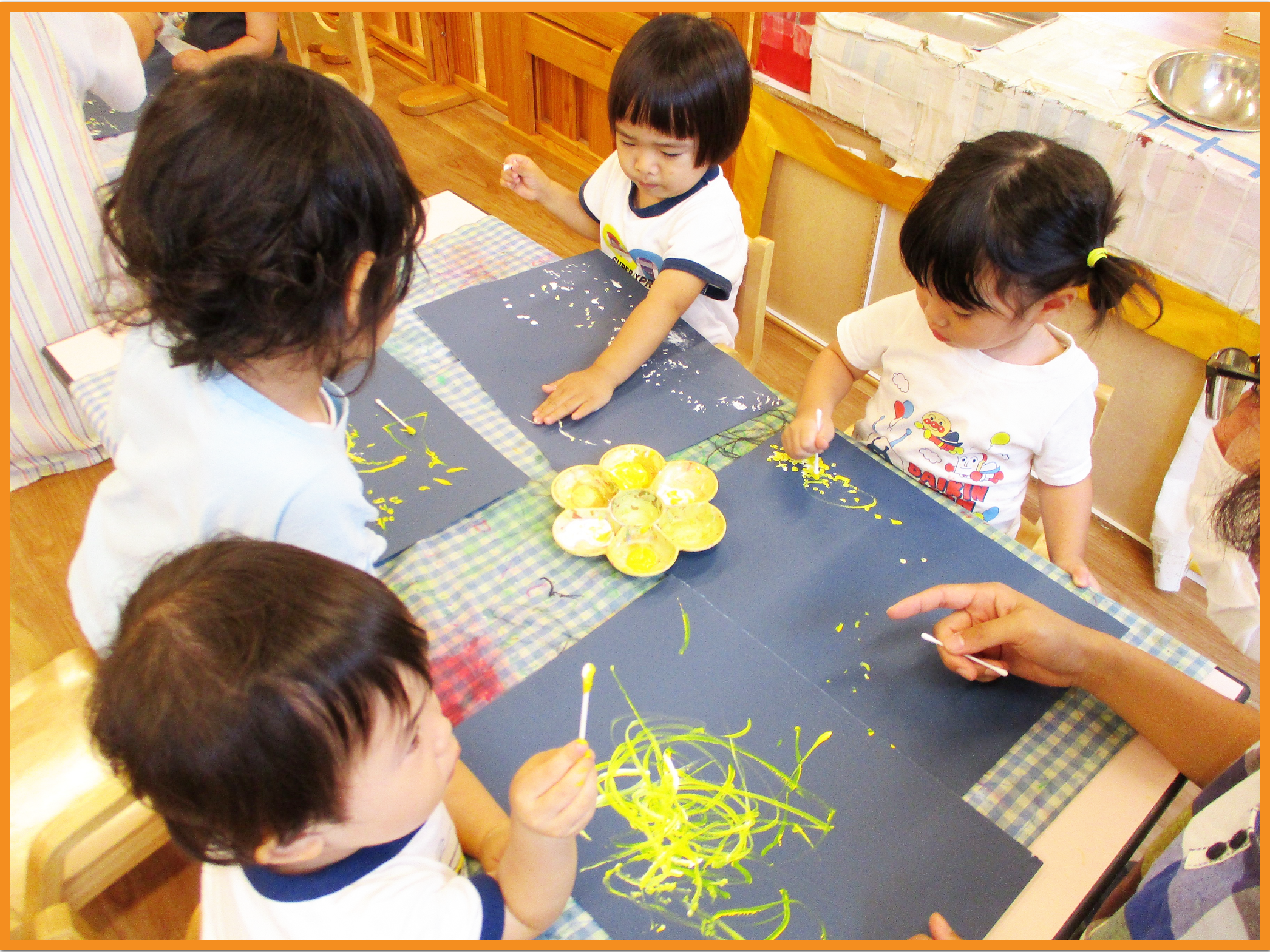 タンポや綿棒を使って、色画用紙に色付けをしました