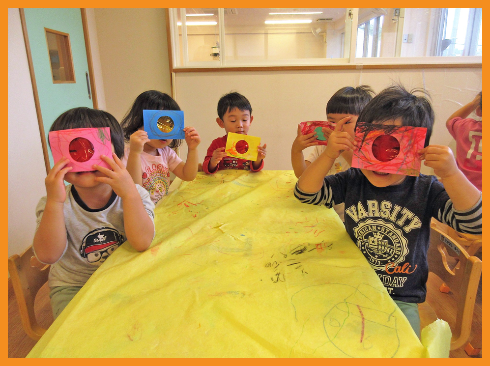 出来上がりを覗くと、「わぁー、黄色だよ」「ピンクに見えるよ」