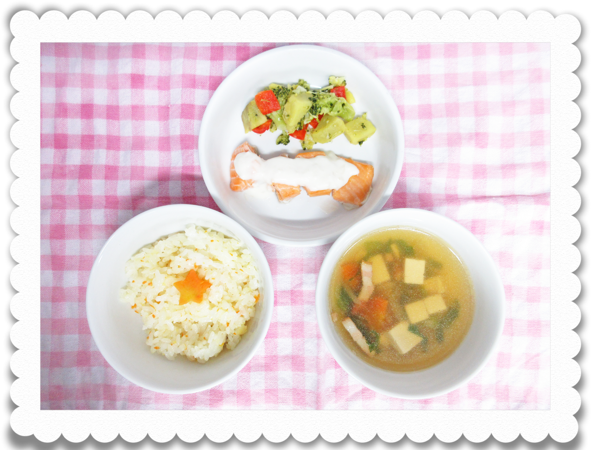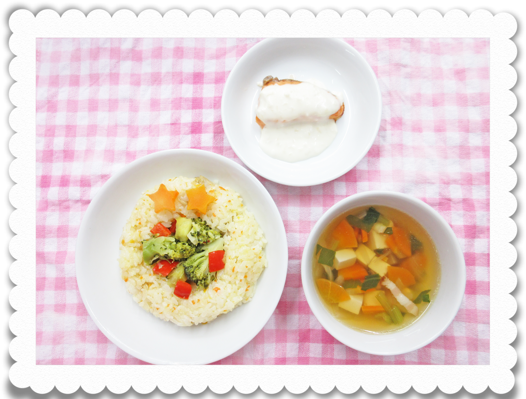 【乳児給食】リースピラフ、生鮭のマヨネーズソース、カラフルサラダ、野菜スープ