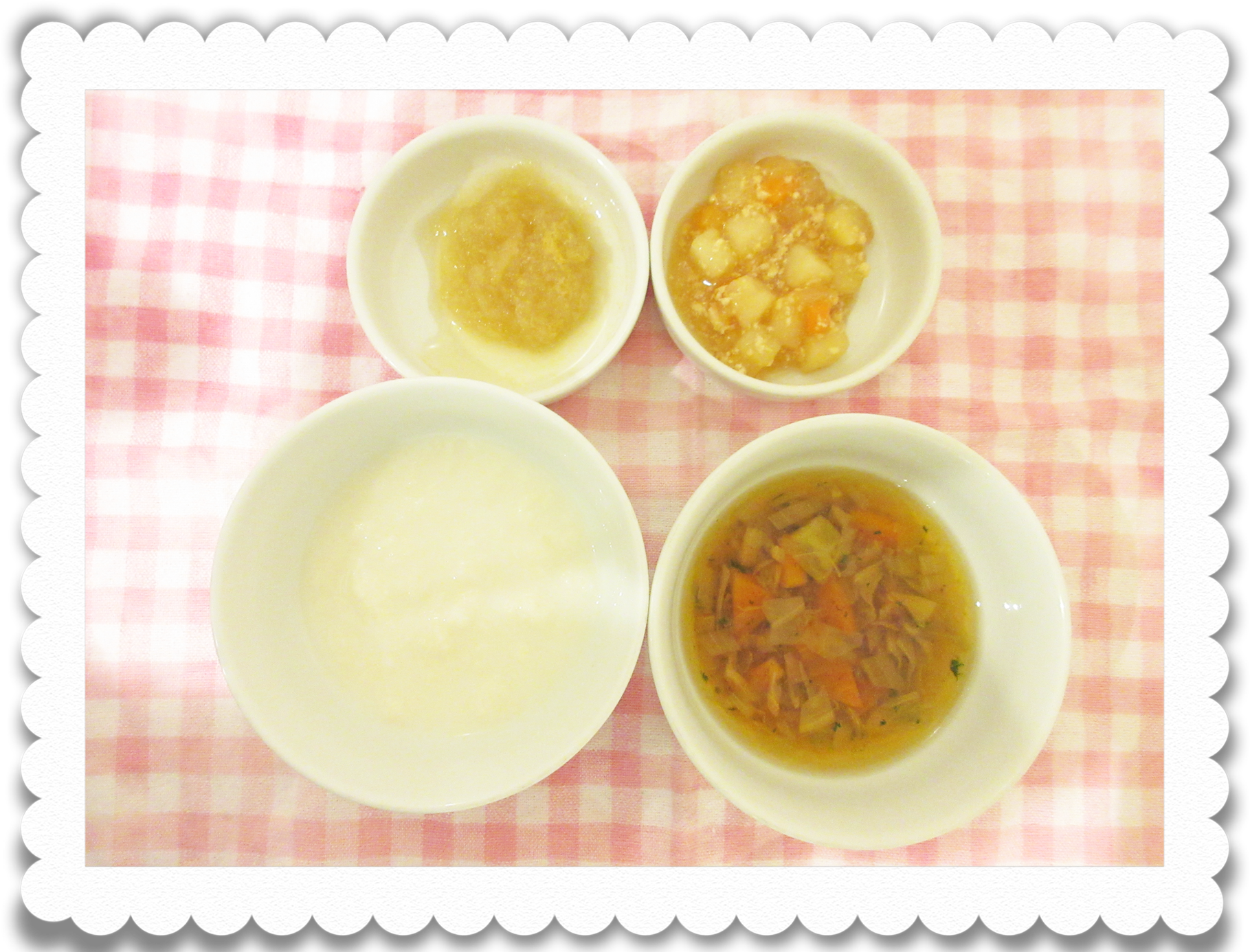 午後食:ミルクパン粥、じゃが芋のそぼろ煮、野菜スープ