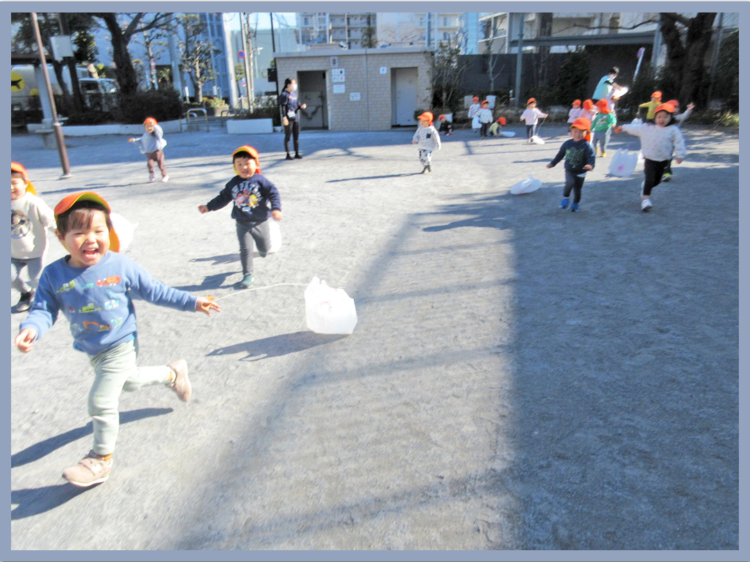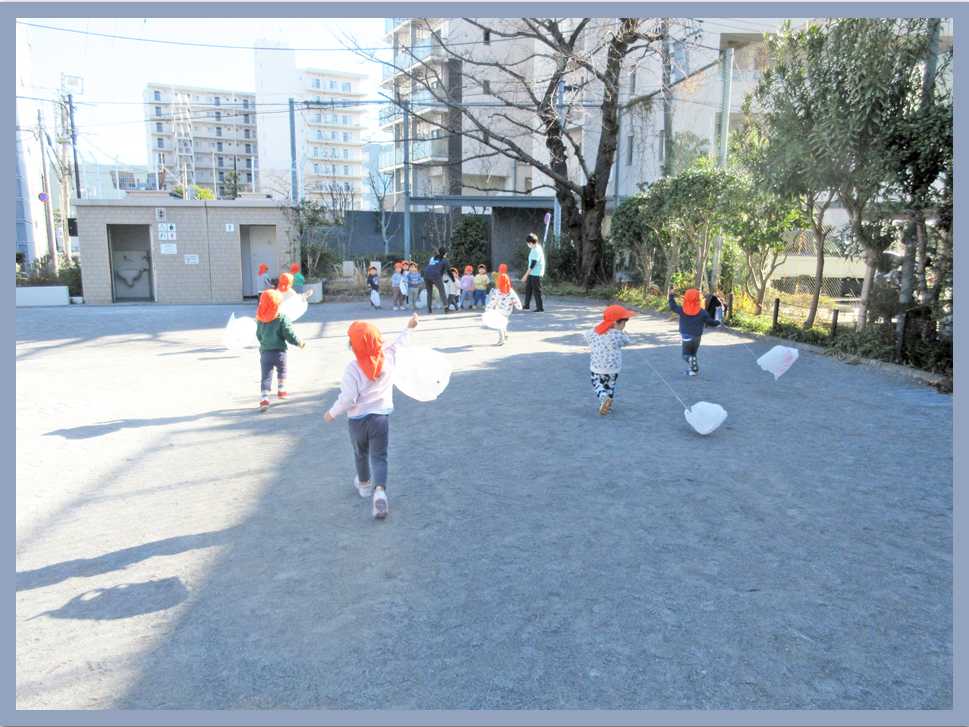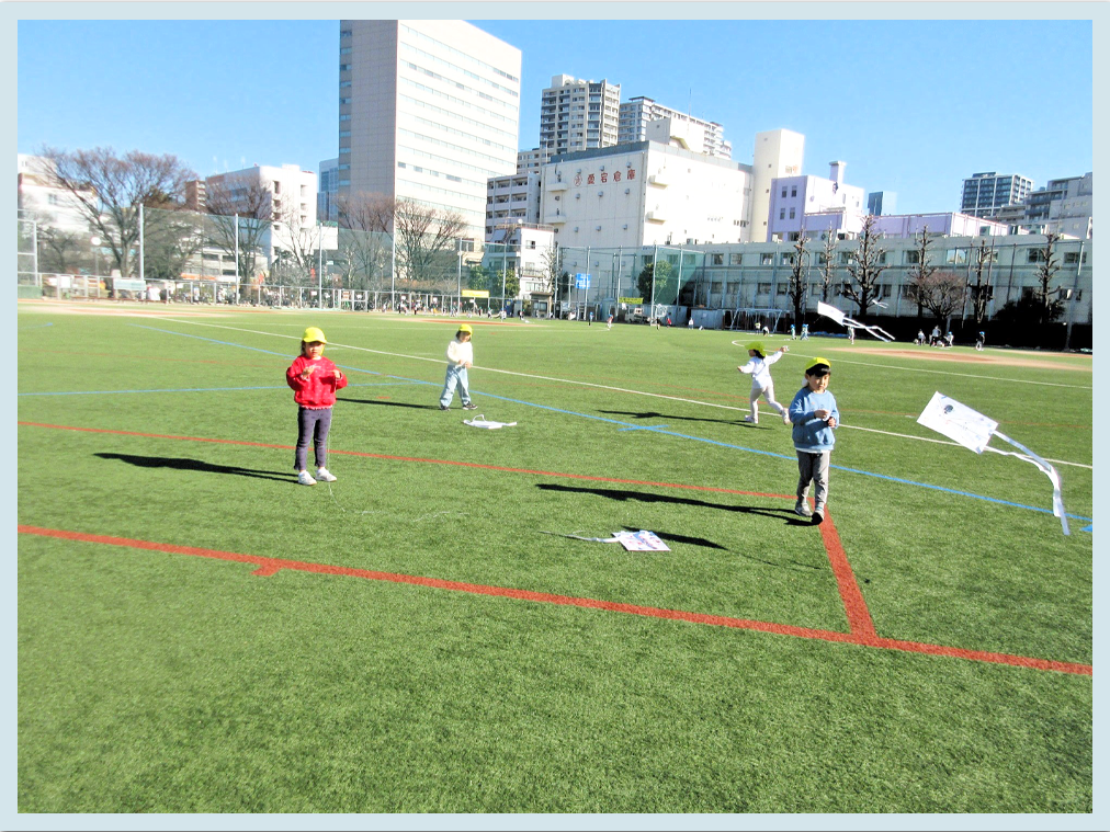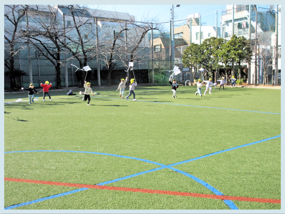 3歳児、4歳児、5歳児は鮫洲公園のグランドで凧あげをしました