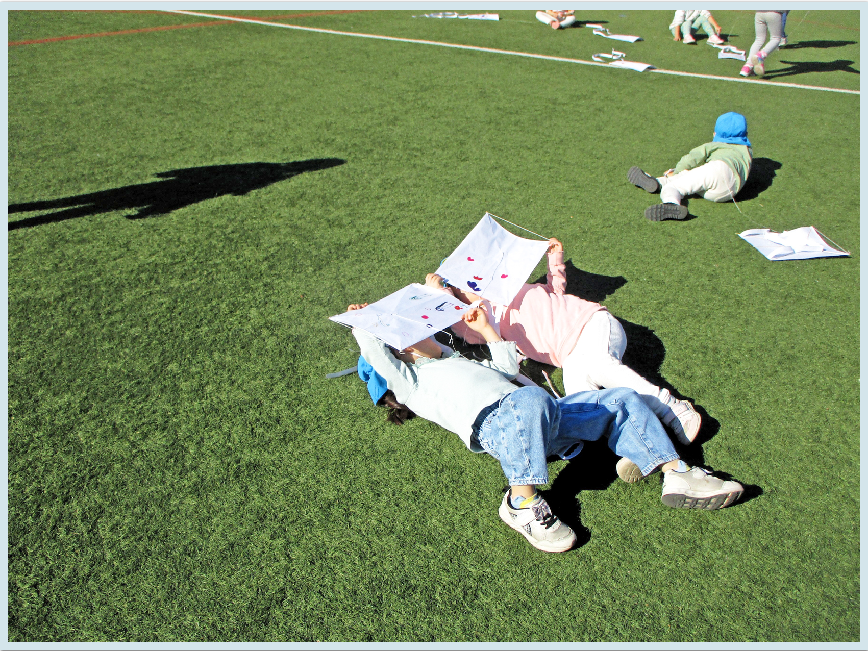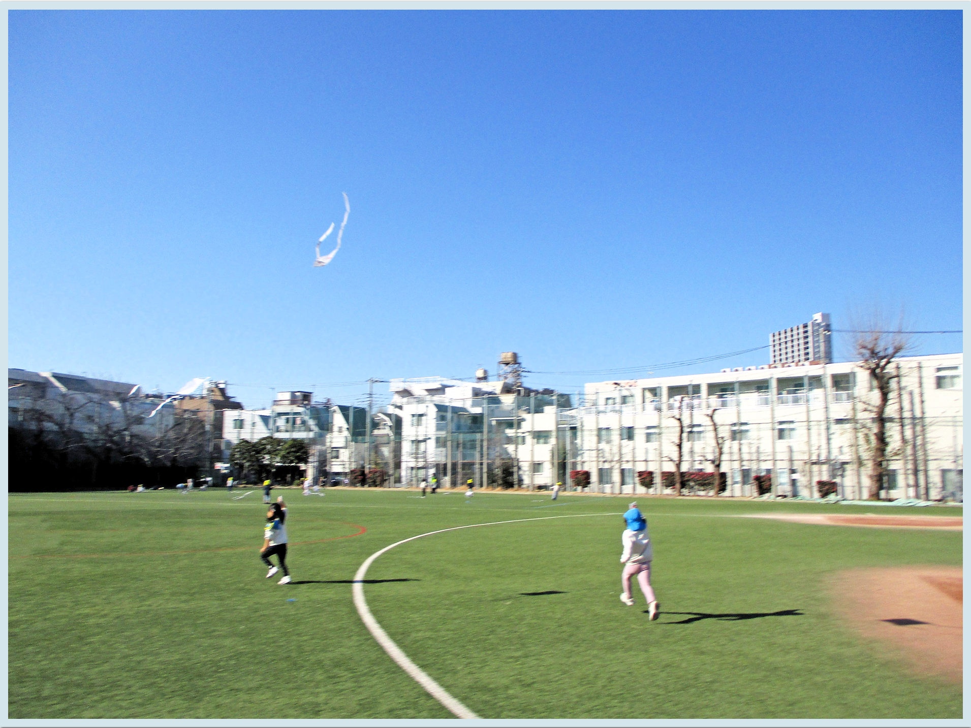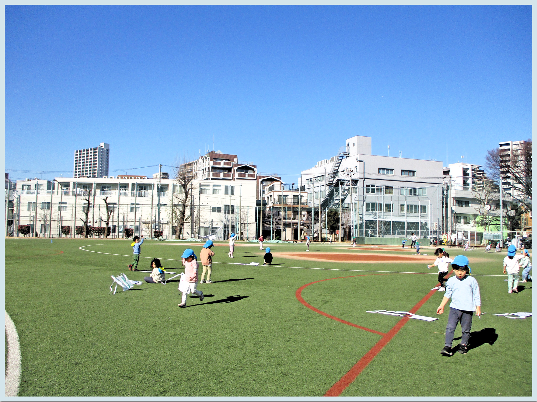 3歳児、4歳児、5歳児は鮫洲公園のグランドで凧あげをしました