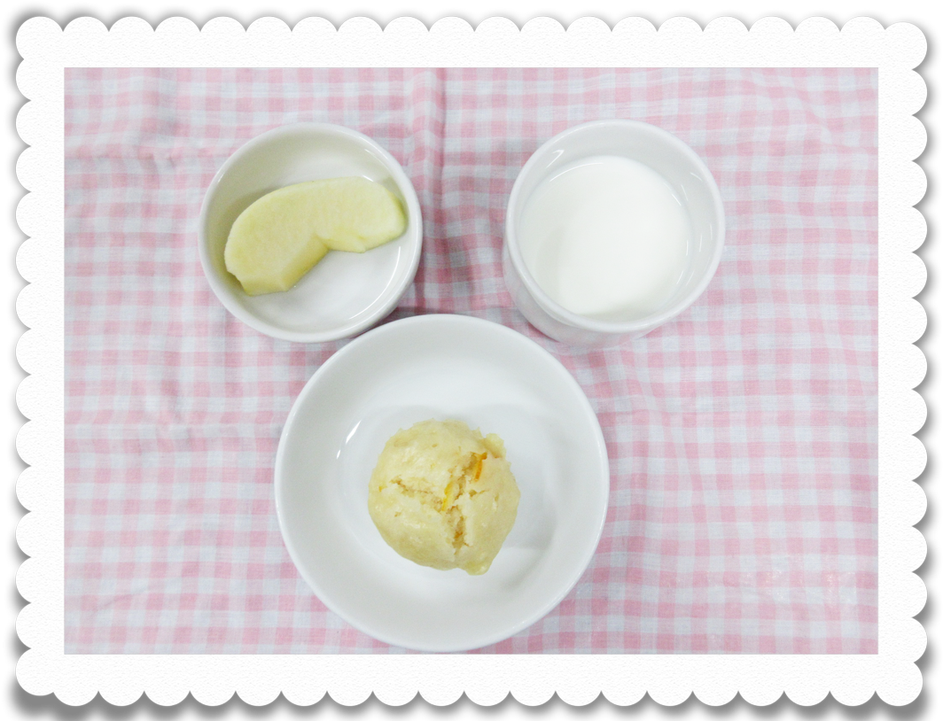 【幼児おやつ】牛乳、オレンジ蒸しパン、果物