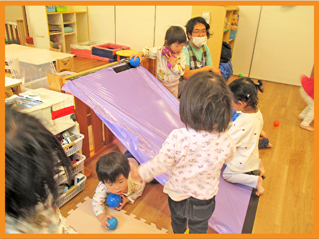 ボールを持ってくぐったり、ボールだけ転がしたり
