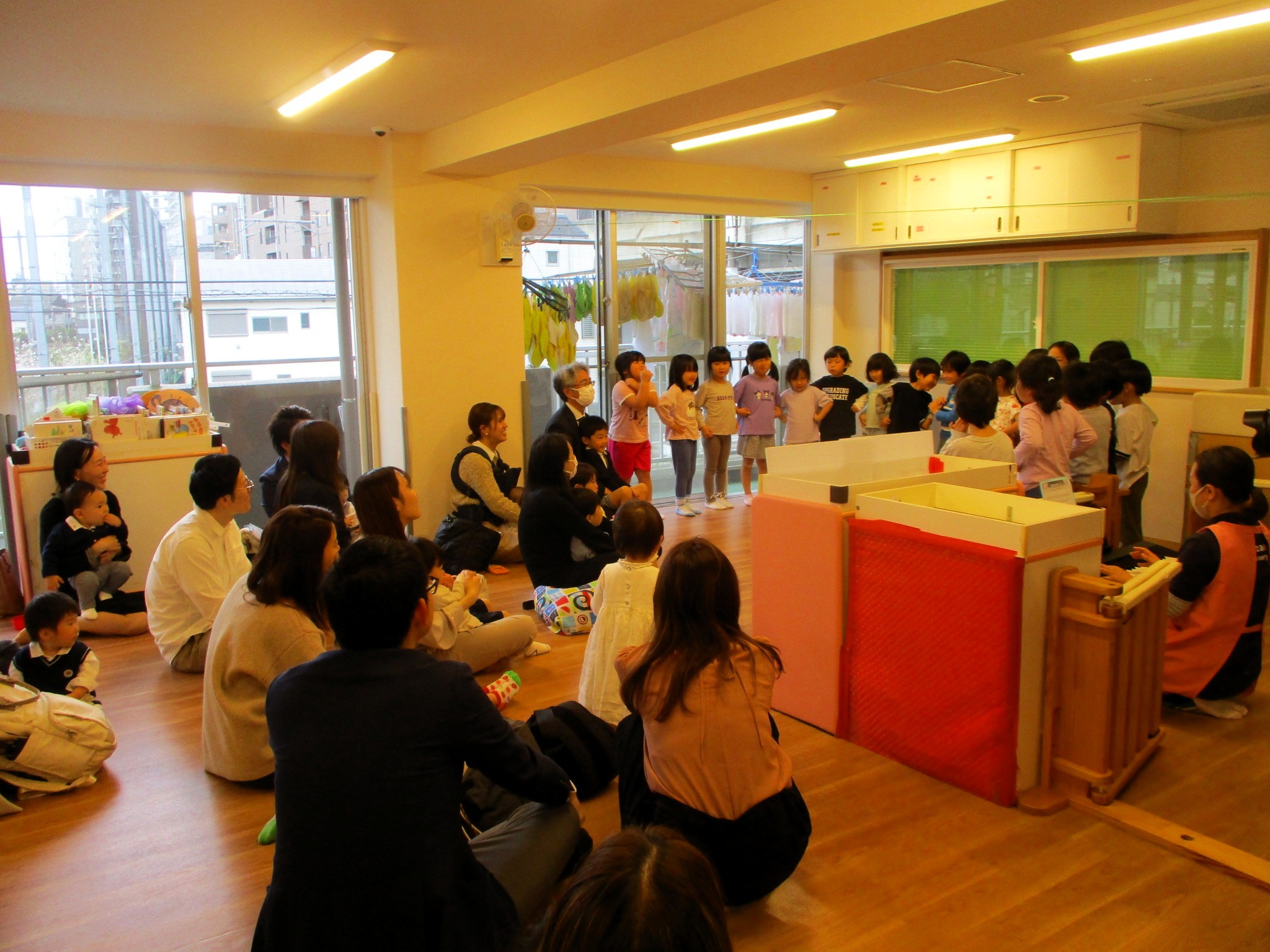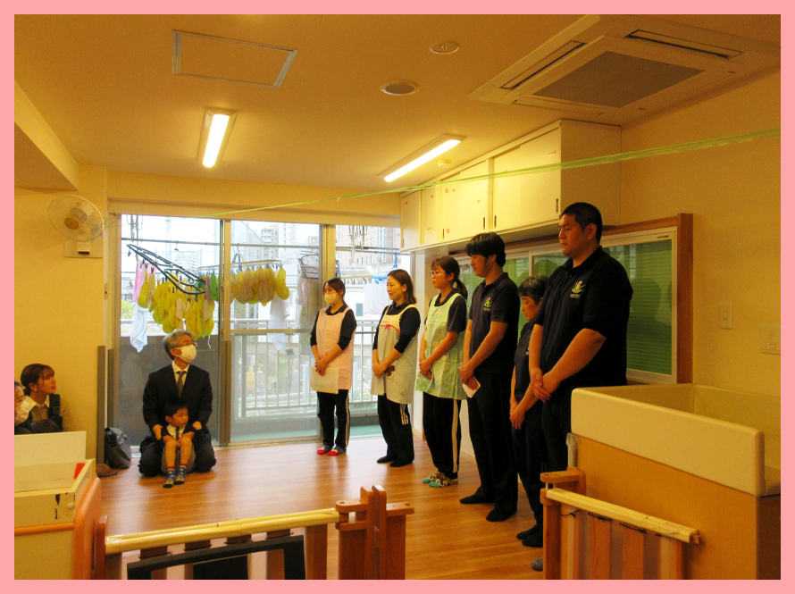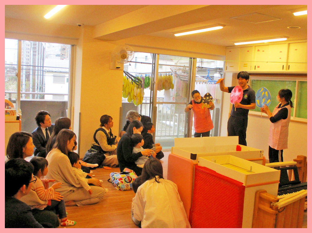 入園式は、職員紹介の後、職員からのペープサートと年長児クラスからの手遊びや歌で入園を歓迎しました
