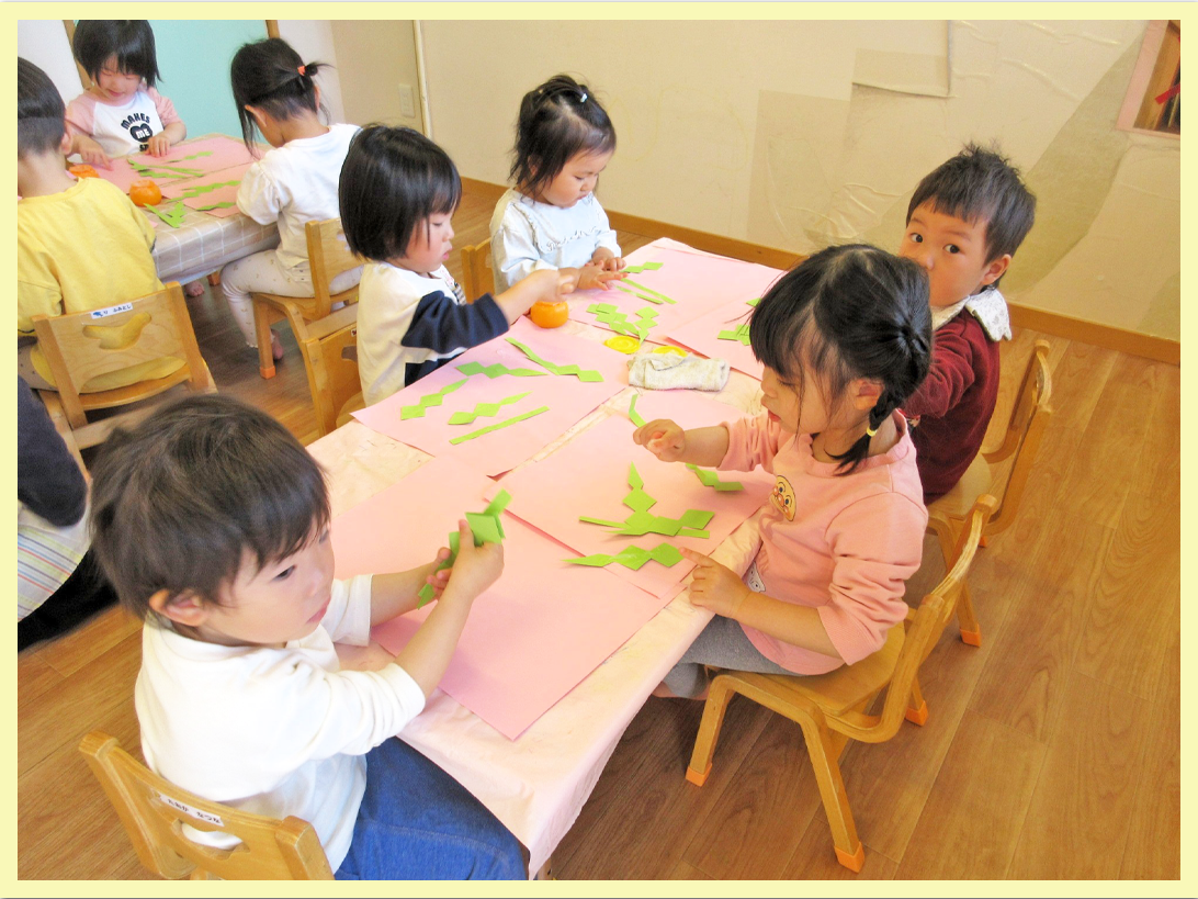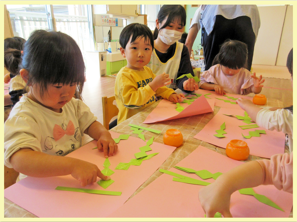 スズランテープを裂いたり、のりを使って台紙に貼ったりしました