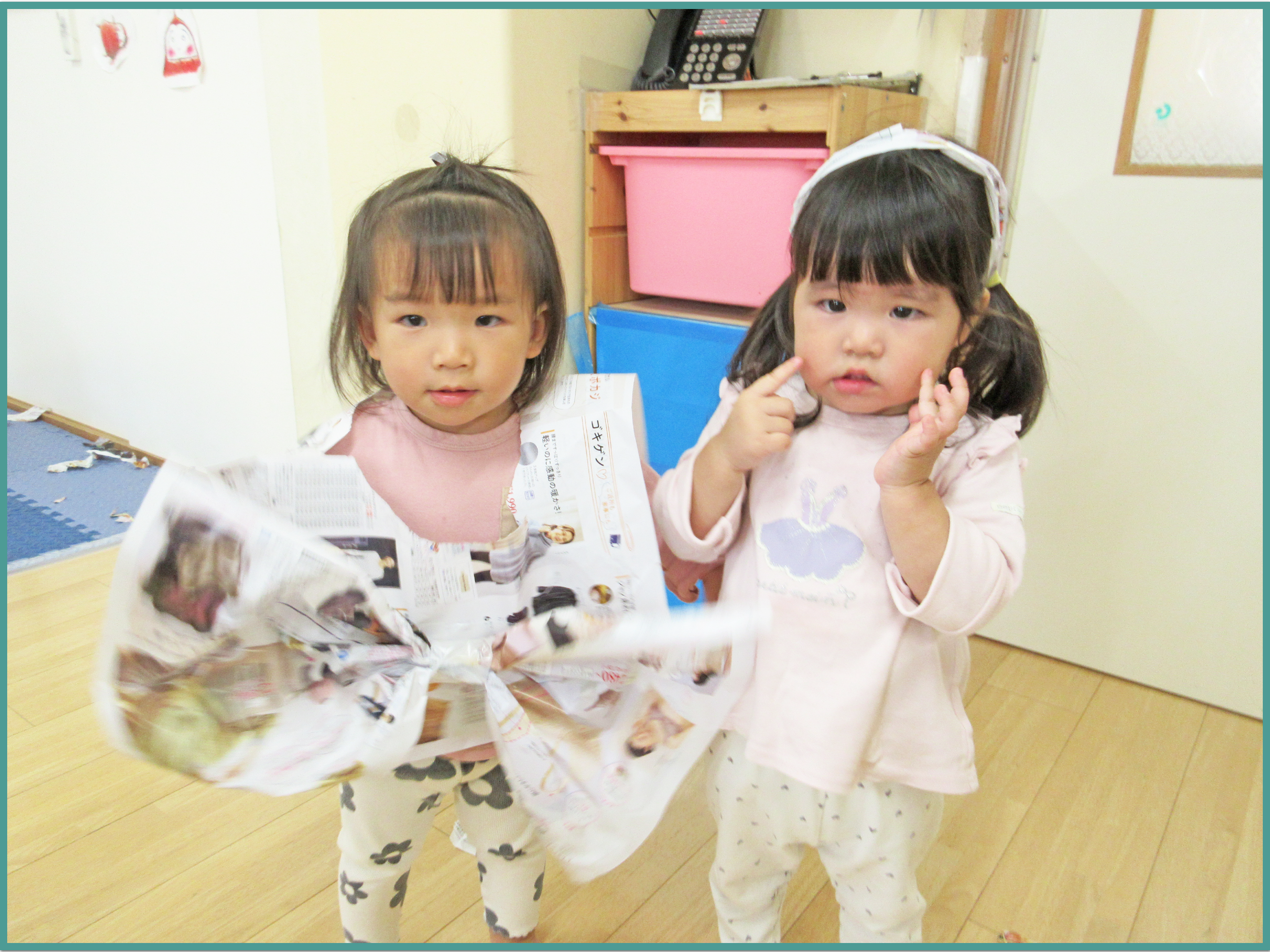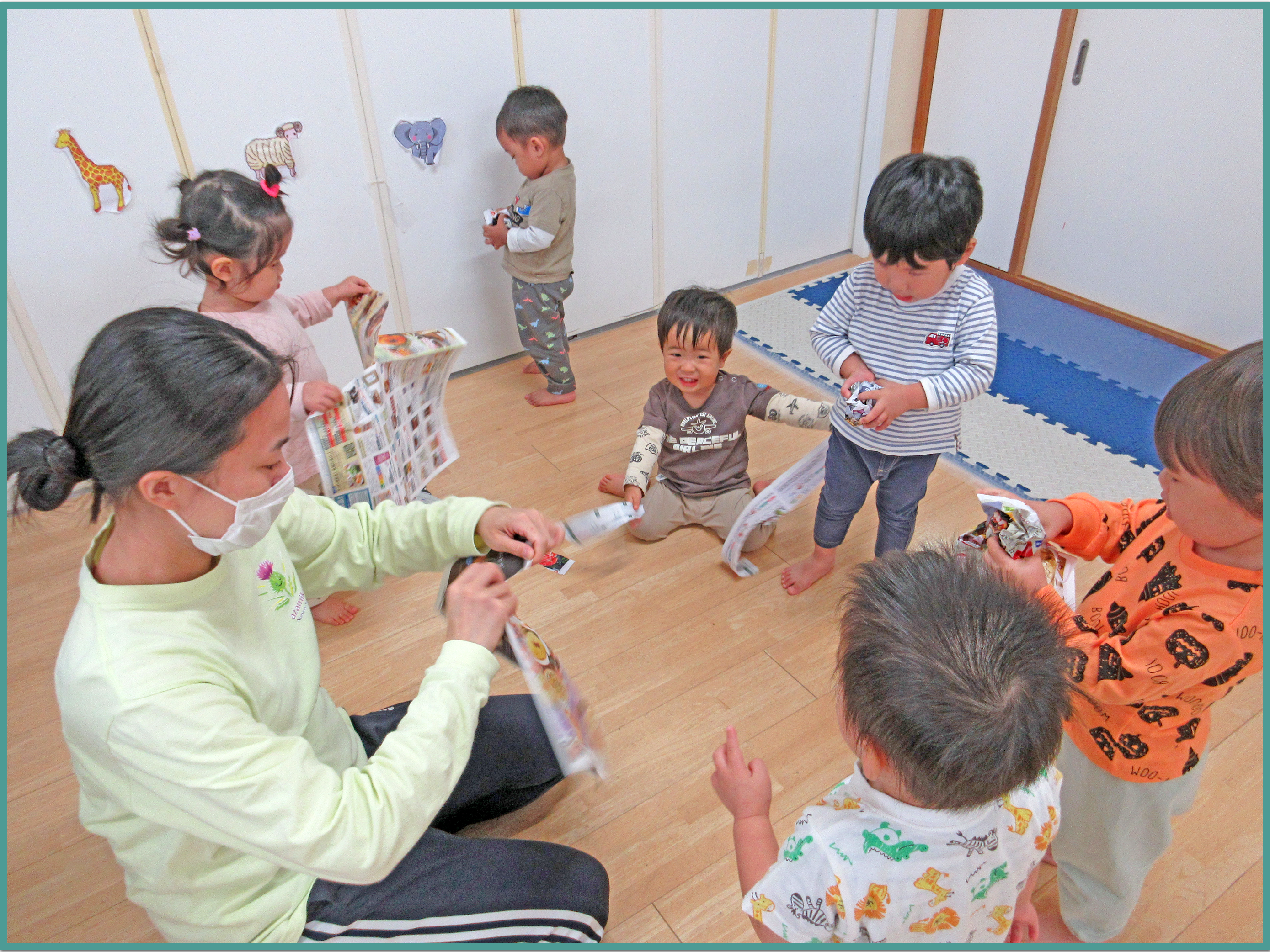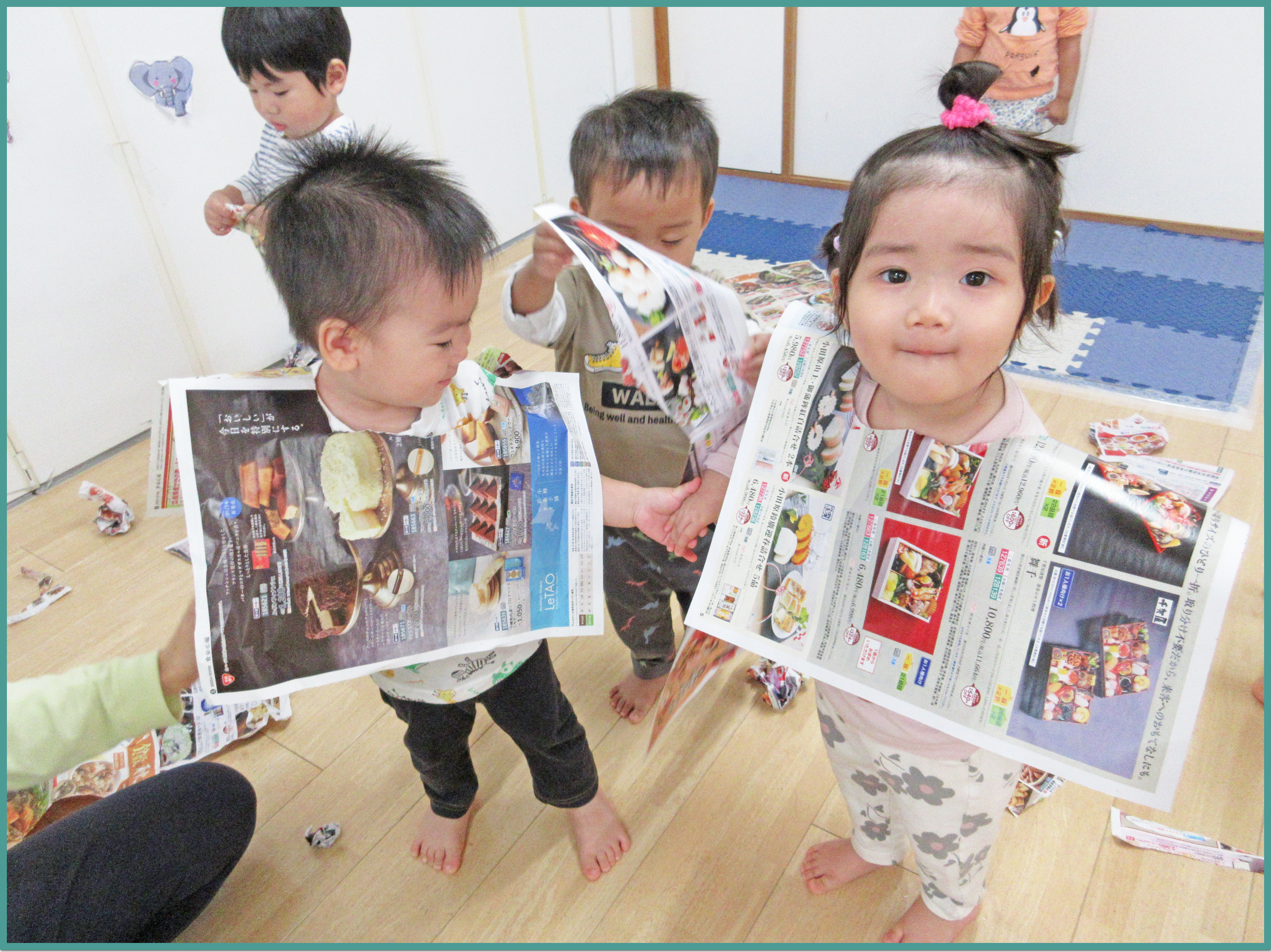 今日は広告紙を使って遊びました。保育者がちぎったり、丸めたりしている姿を見て真似をしているこどもたち。広告紙シャワーが特に楽しかったようで、「さんっ、にっ、いちっ」