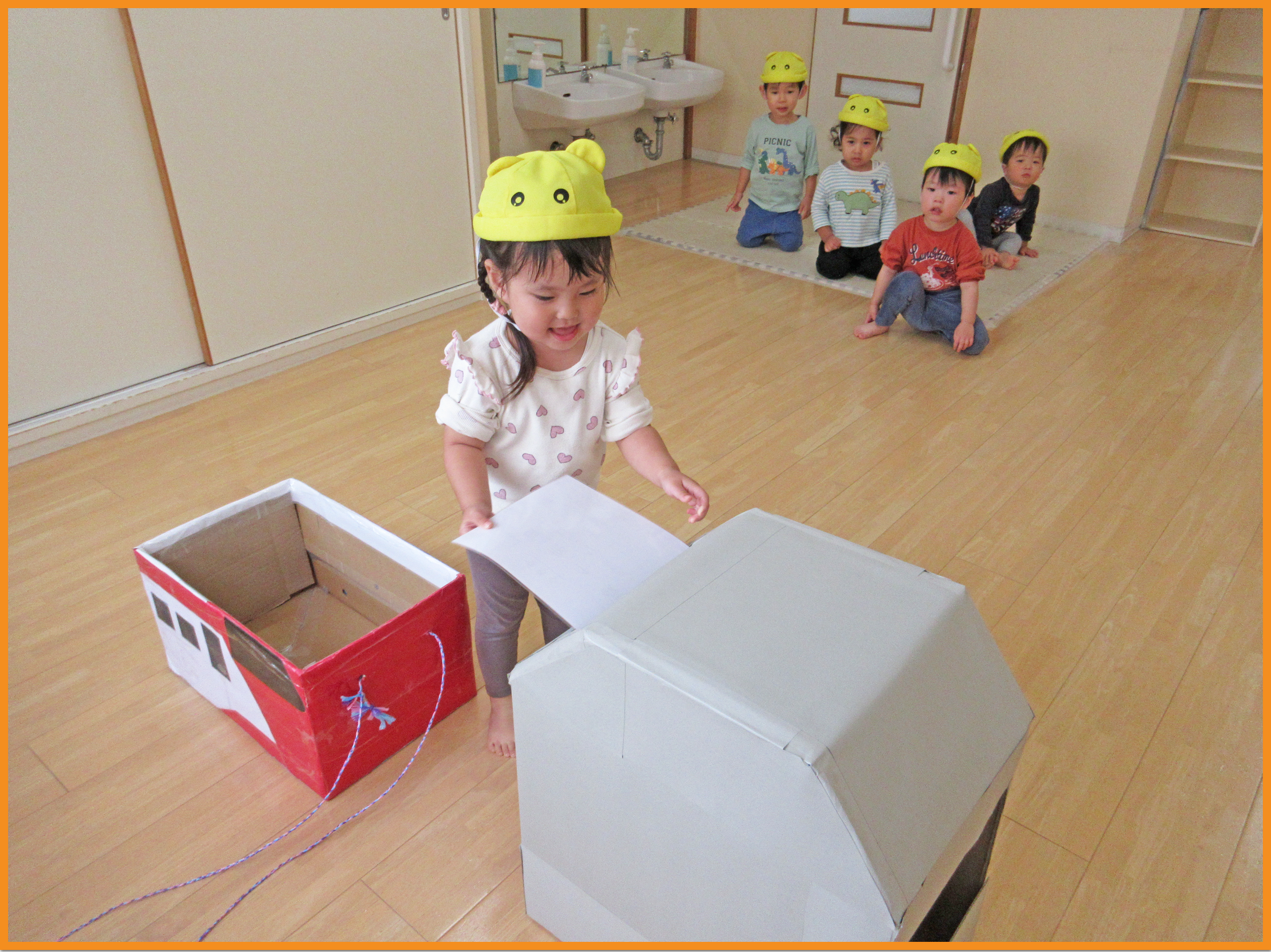 今日は、室内で運動会ごっこをしました。新幹線に見立てた箱車に乗ったり、改札に切符を通したり、トンネルを潜って遊びました。「出発進行ー」と保育者が伝えていくと、こどもたちも「しんこー」と喜んで遊んでいました。順番子に遊んでいくと「待ってるね」「いってらっしゃーい」と手を振りながら順番を待っていました。
