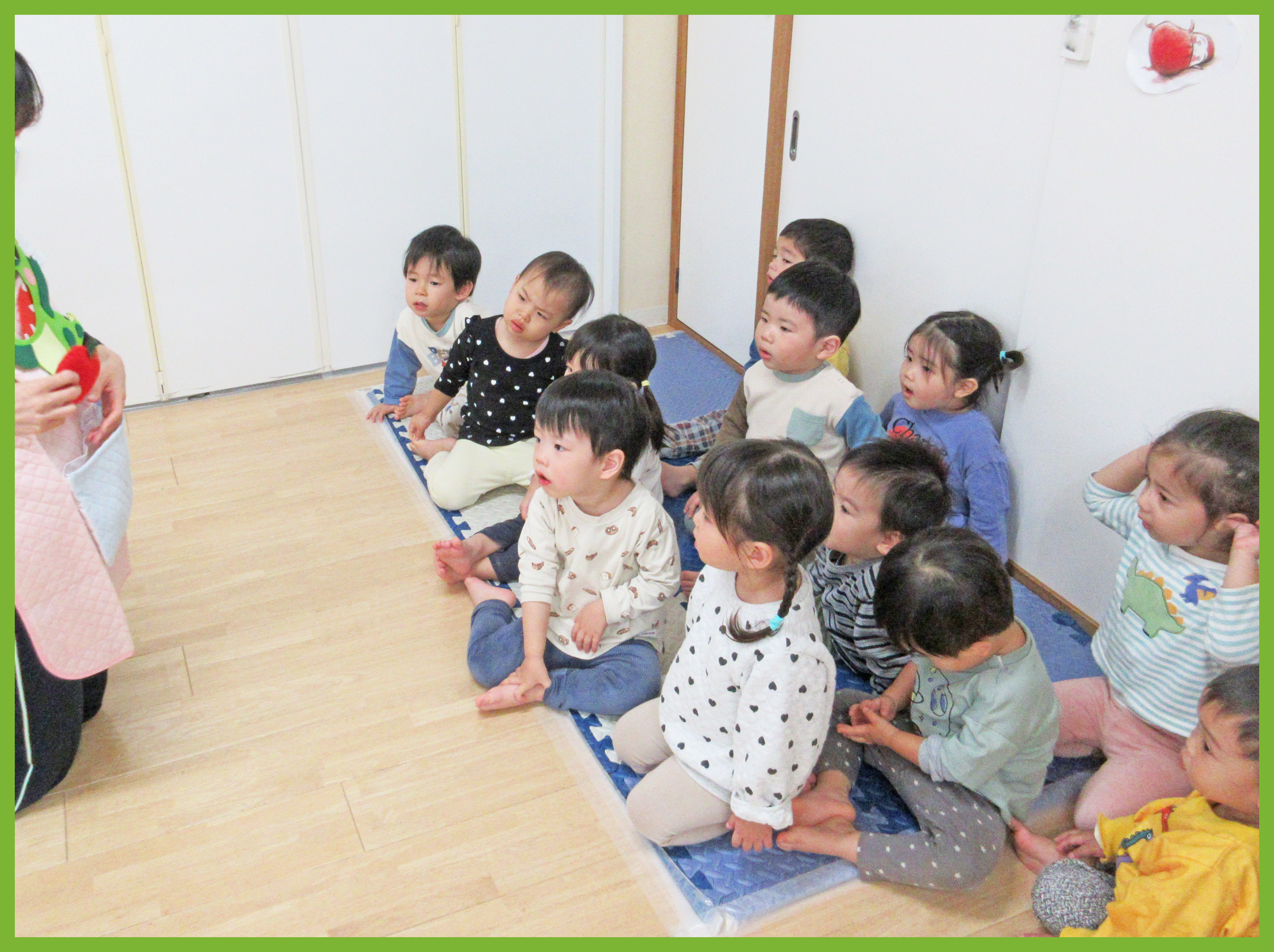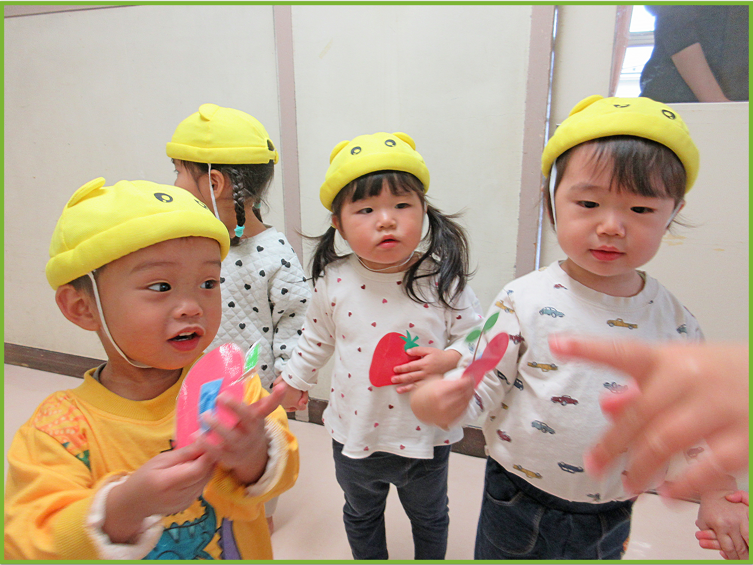 朝の会で怪獣が美味しい物を食べるエプロンシアターを楽しんでいたので、園内に食べ物を隠してみんなで園内探索をしました。