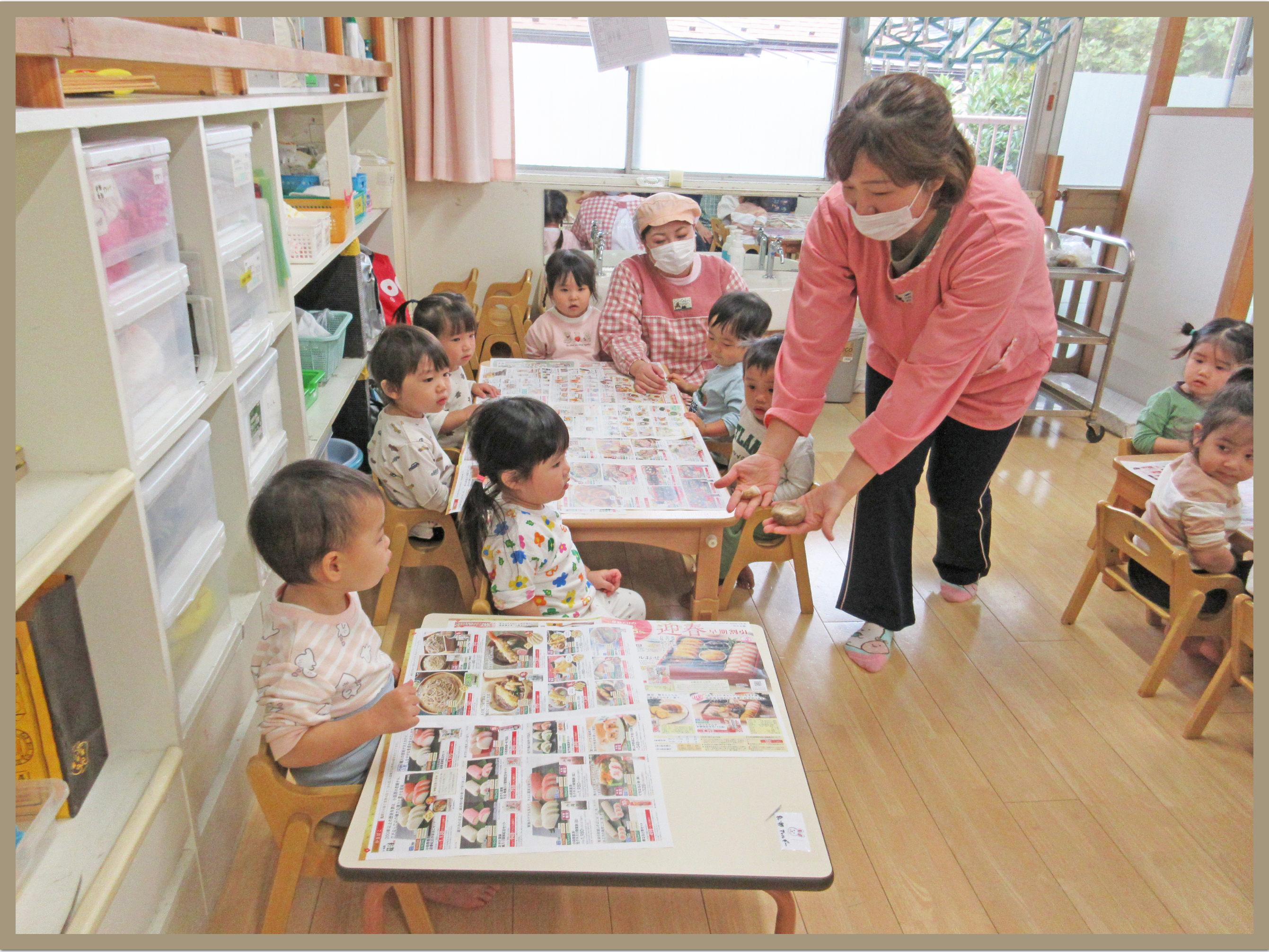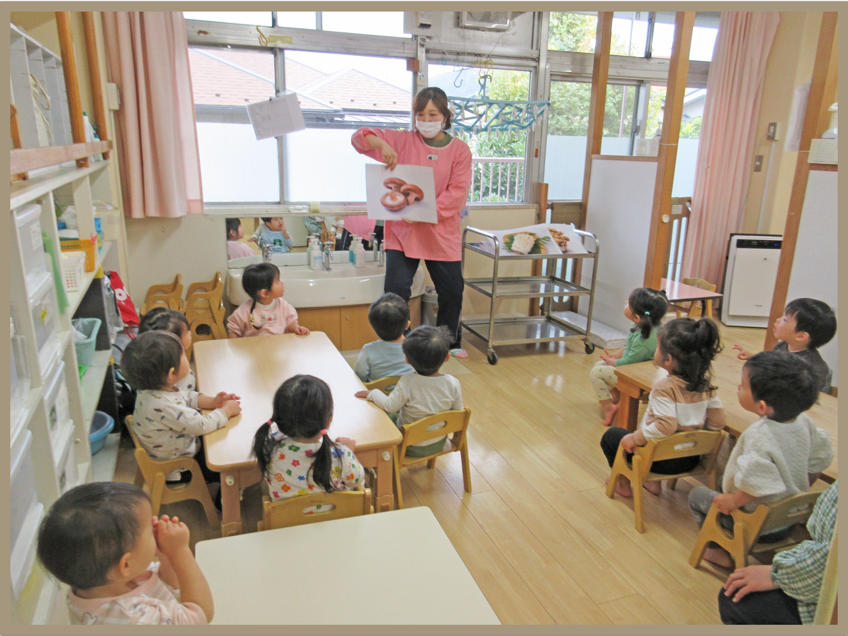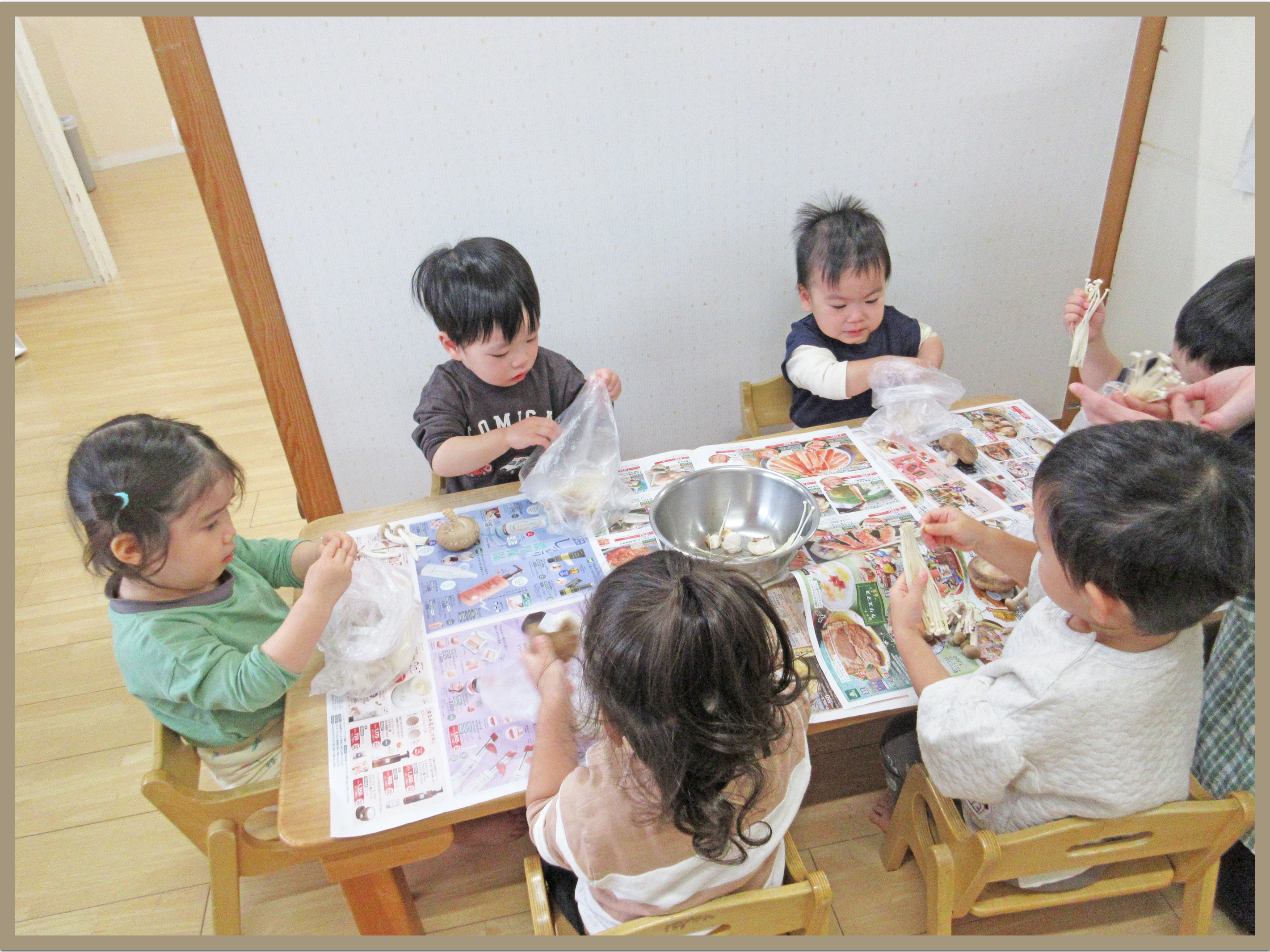 今日は、給食の先生と一緒にきのこをさく活動を行いました。前週にきのこの製作をして部屋を飾り付けしていた為、きのこを見ると「きっきっきのこ」ときのこの歌を歌って楽しそうに参加することが出来ました。えのき・しめじ・しいたけのきのこの違いを感じながら細かくさいていきました。ひとつずつ細かくさく子もおり、集中して行っていました。明日のおやつに食べるのを楽しみにしているこどもたちでした。
