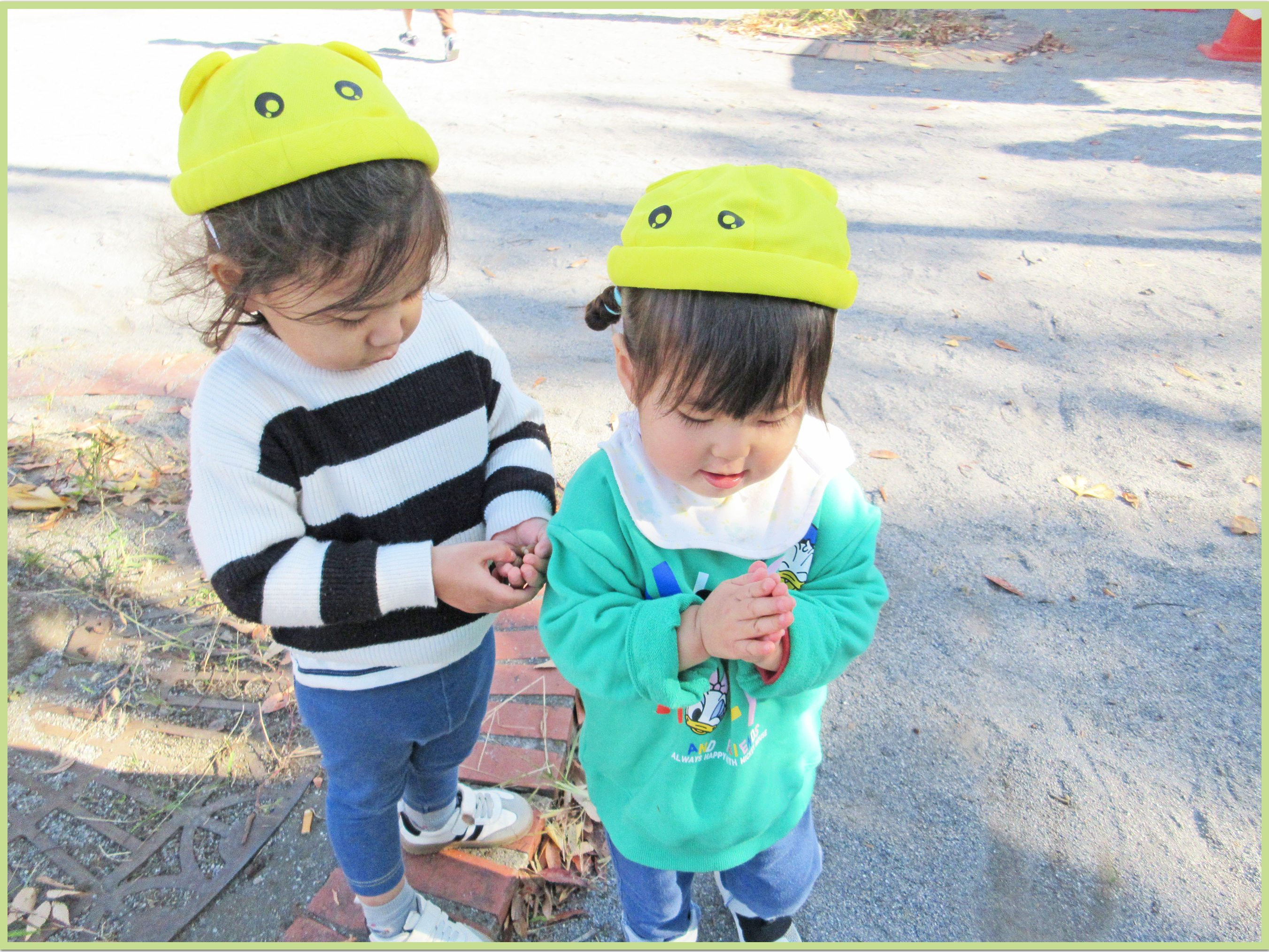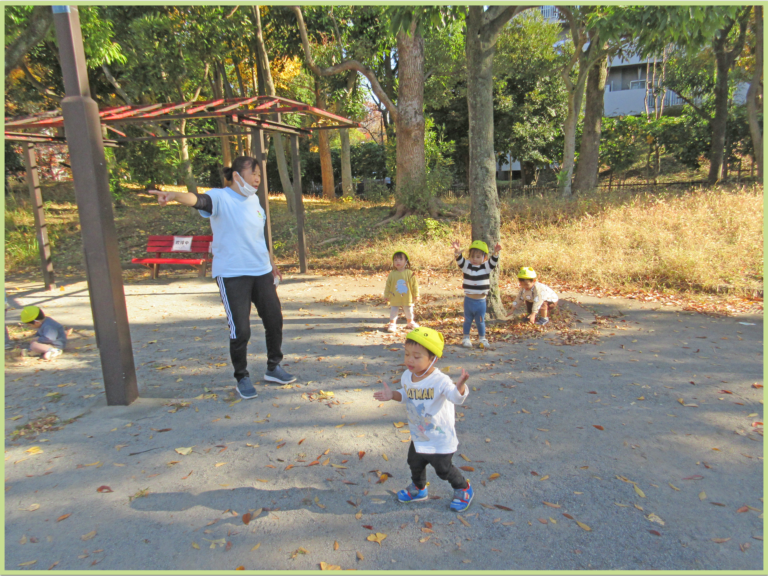 また、保育者が落ち葉でおばけの顔を作ると「ばけばけはっぱだー」「おばけだぞー」と指差しをしながら嬉しそうに友だちと笑いあう姿が見られ、とても可愛らしかったです。