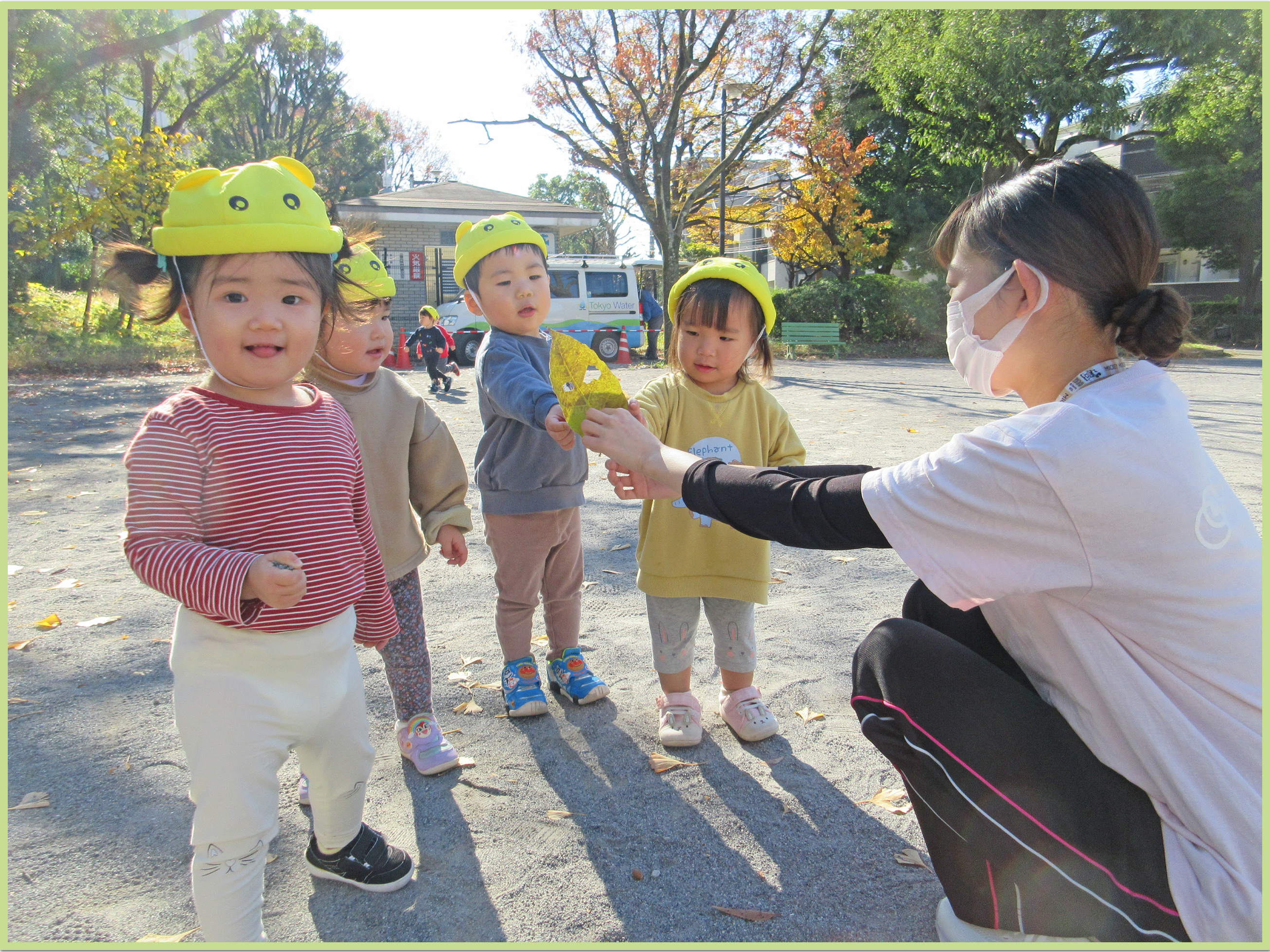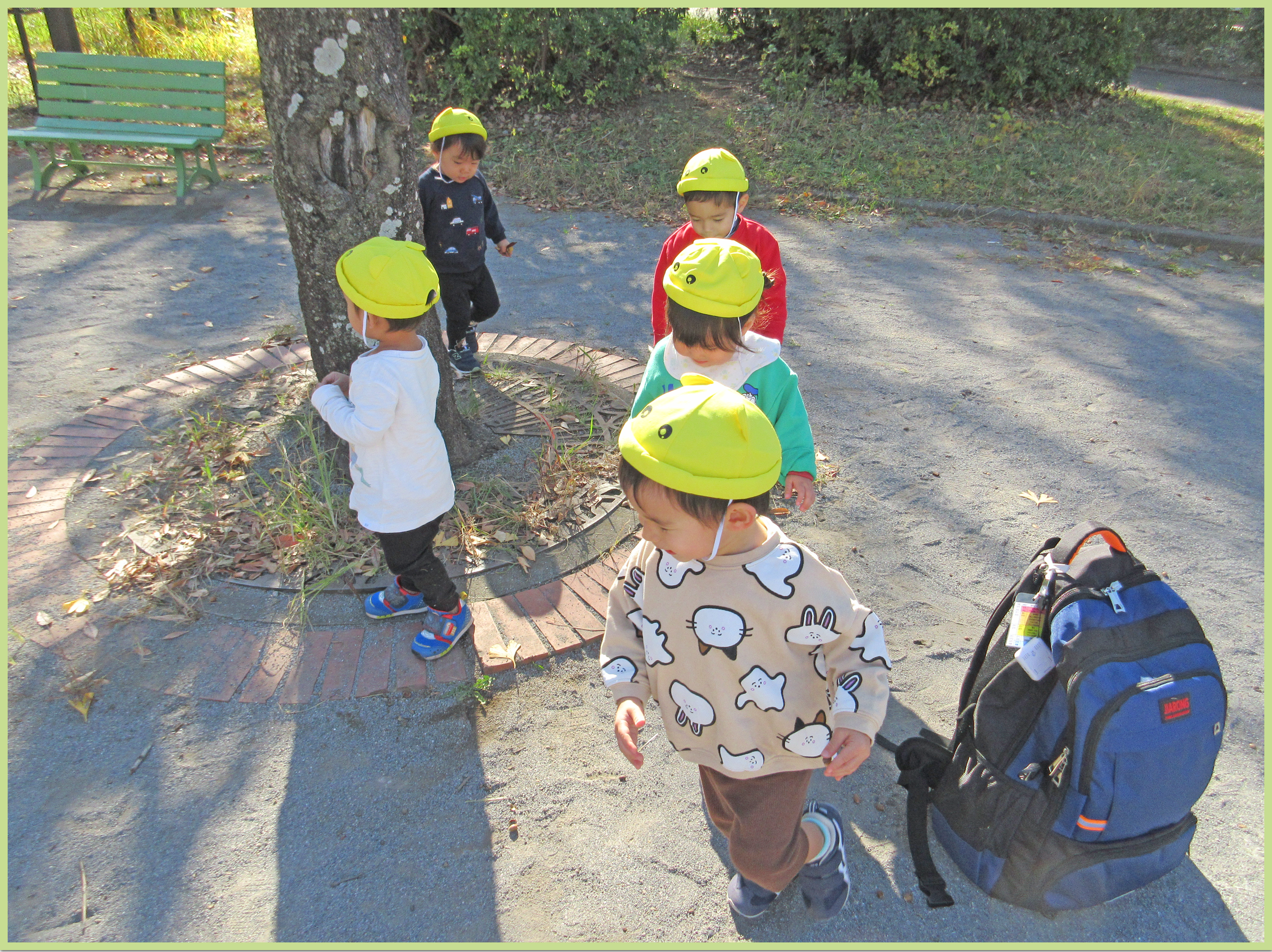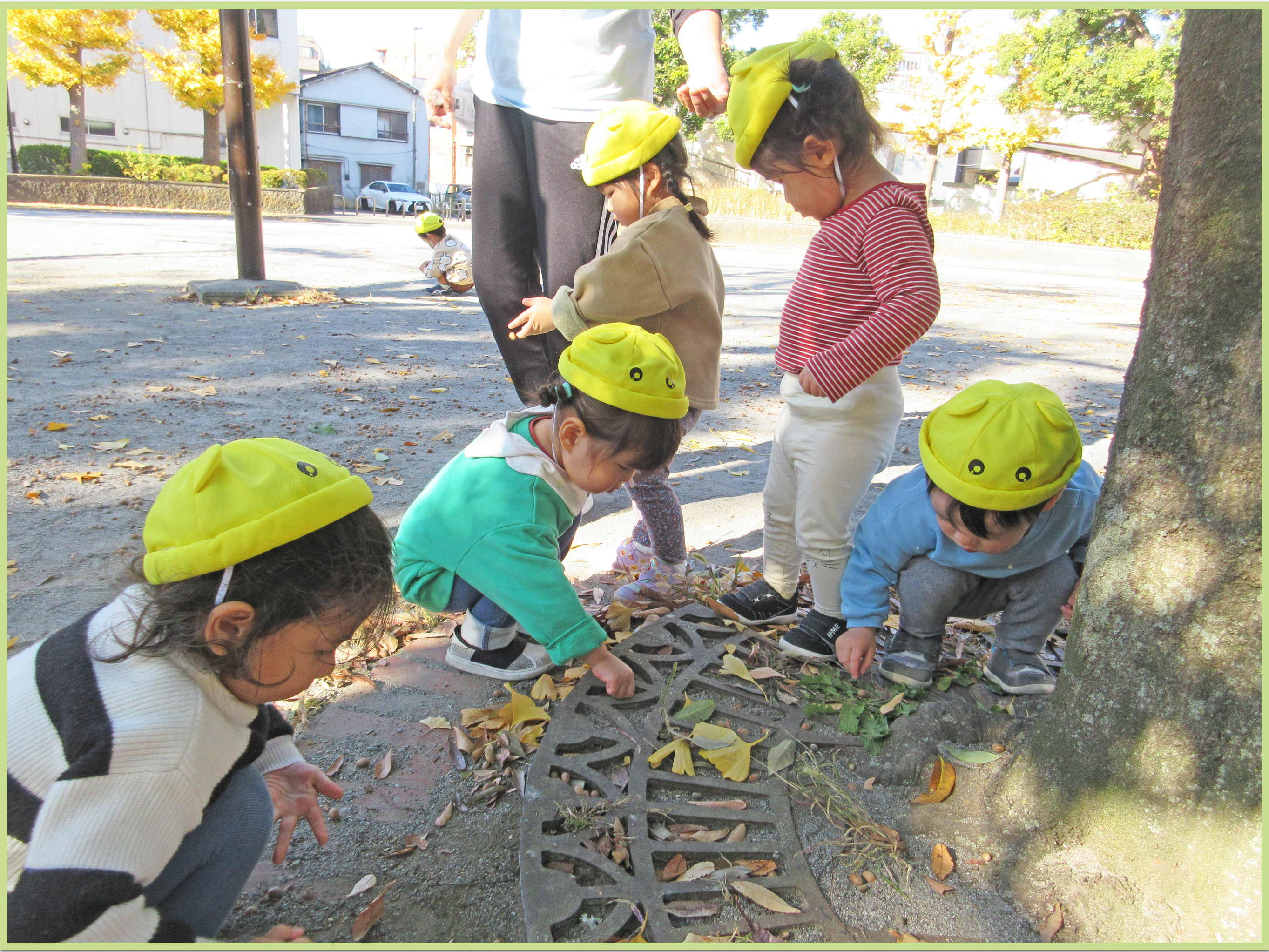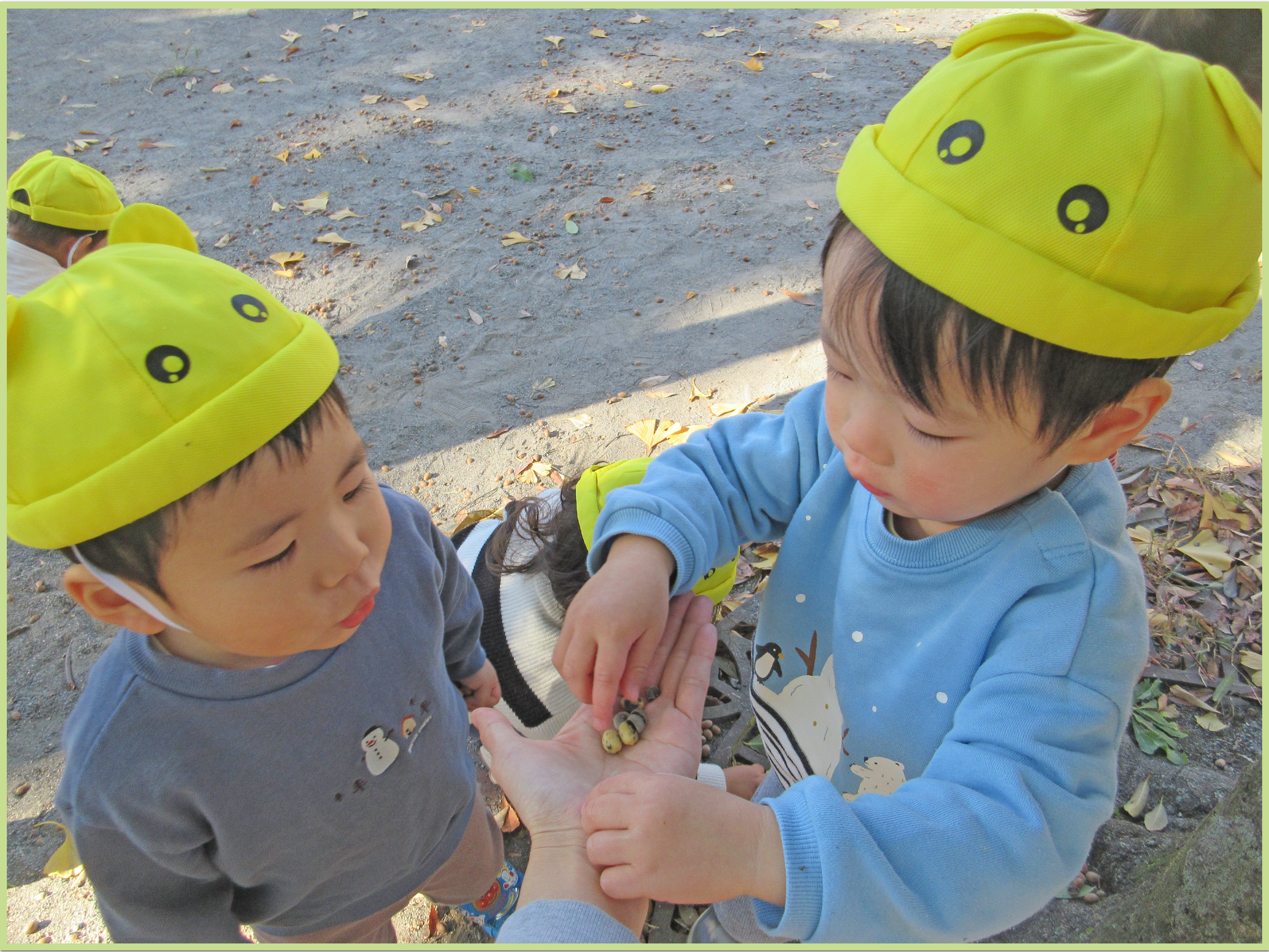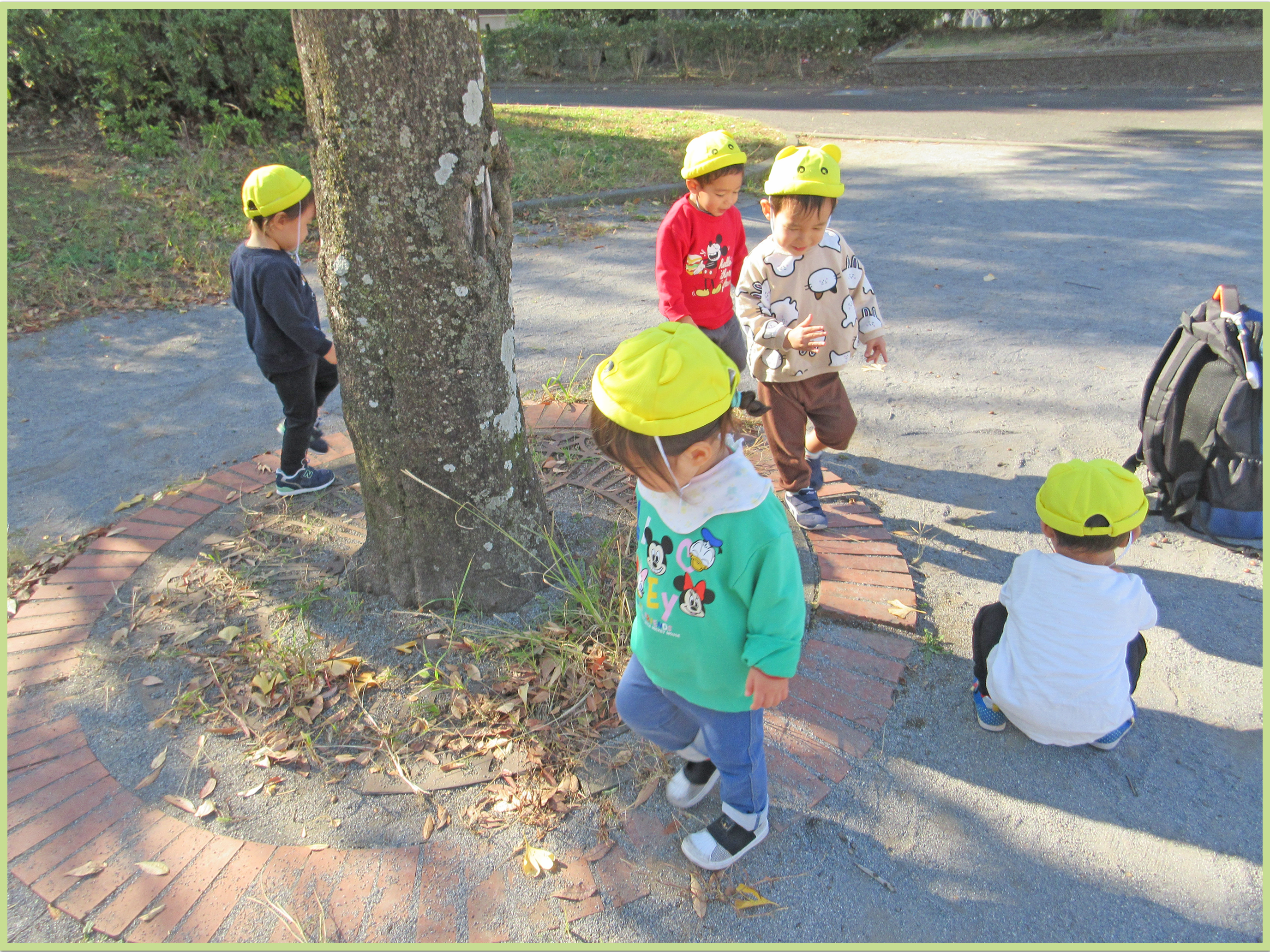 公園では、木の周りのレンガを線路に見立てると1列になって「しゅっしゅっぽっぽー」と電車ごっこをしてみたり、どんぐりの帽子を保育者の手のひらに集めてみたり、言葉のやり取りを楽しみながら元気いっぱいに遊ぶ姿が見られました。