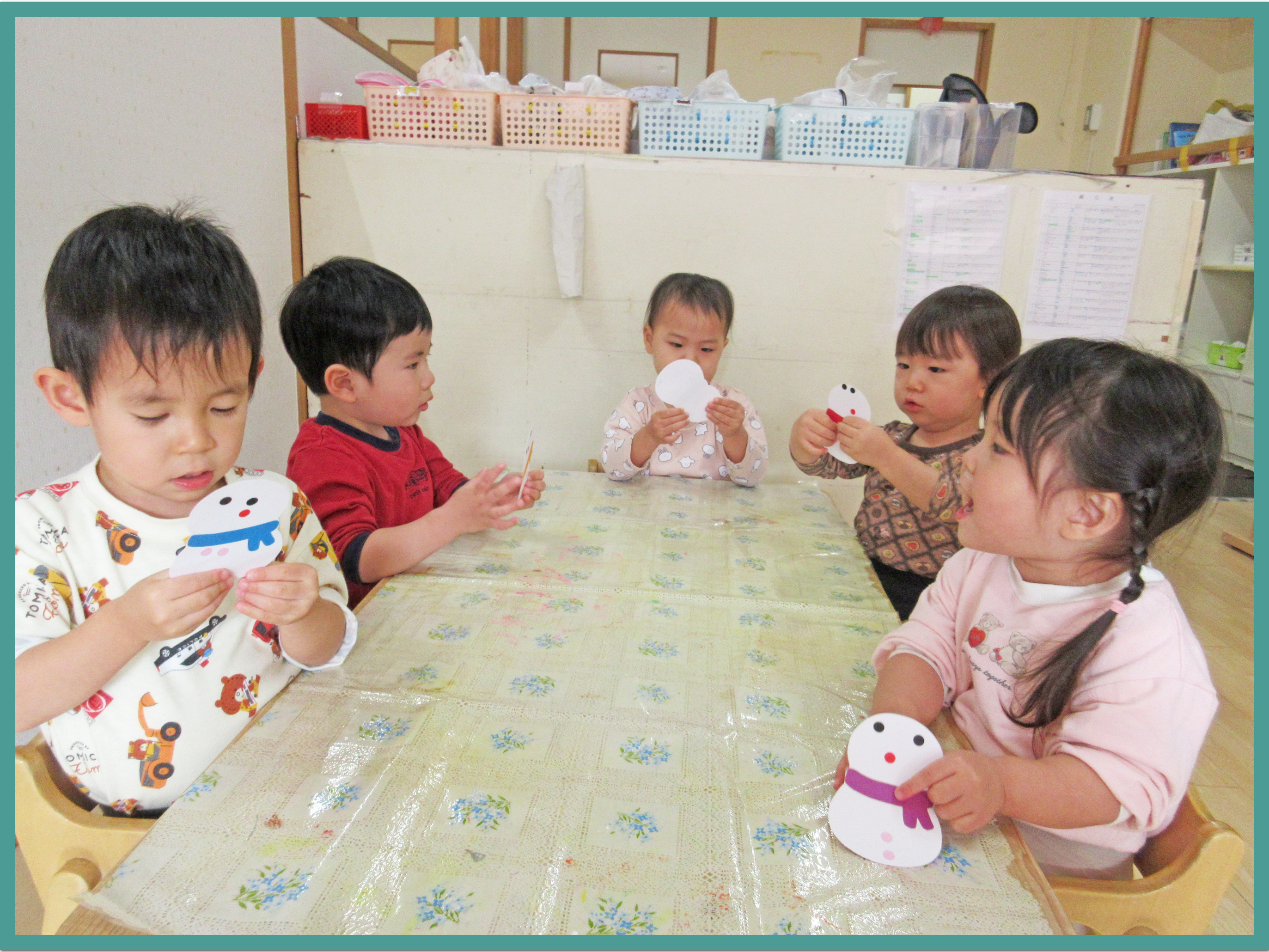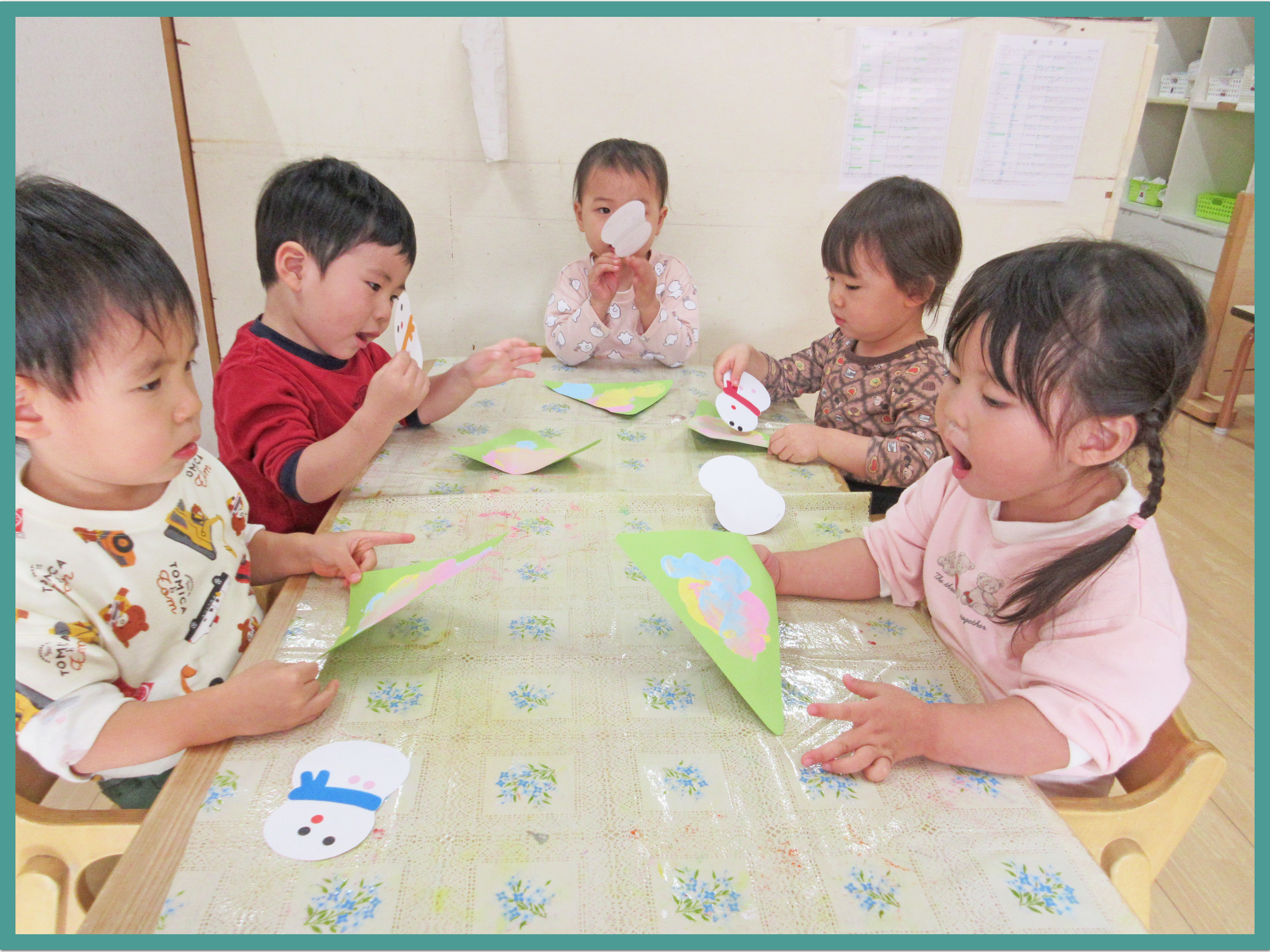 今日は、室内でクリスマスの製作をしました。始めに雪だるまのマフラーの色を選び、顔やボタンをシールで貼っていきます。「可愛いね」「おめめできた」と嬉しそうにお話ししながら貼るこどもたち。小さな風船を使ってツリーに色付けをする際には、保育者の言葉を真似して「ぽよん、ぽよん」と言いながら風船の跳ね返りを楽しんでいました。完成した作品をお友だち同士で見せ合いながら、「じゃじゃーん、見て、じゃじゃーん」と繰り返し話す姿が微笑ましかったです。
