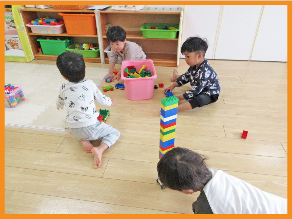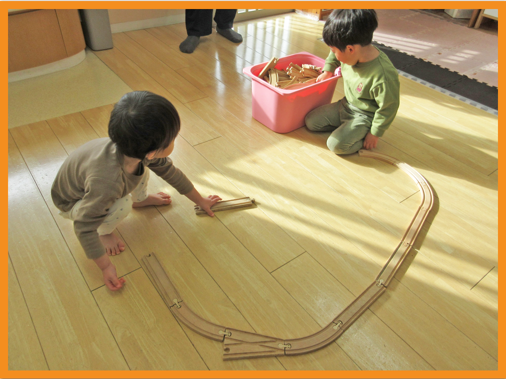 今日は、長期休みの後だったので室内でゆったりと過ごしました。朝の会でこどもたちに何をして遊びたいか聞いてみると「電車」「おままごと」「サンタさんにもらったブロック(フラワーブロック)」とたくさんのリクエストが出たので、遊ぶ場所を分けて好きな遊びを楽しみました。「プップー先生見て」「入れて」「一緒にやろう」「こっちで遊ぼう」などおともだちや保育者を誘い合いながら一緒に遊ぶ姿が増え、遊びの幅も広がってきました。
