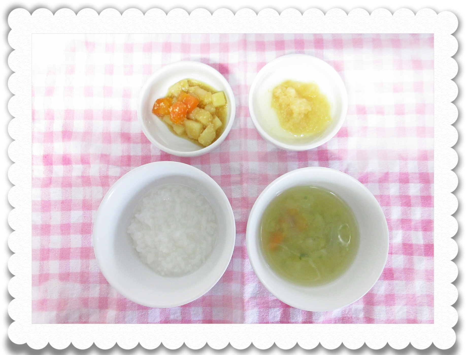 午前食:スープパン粥、白身魚のムニエルフレンチあえ、ベジタブルスープ