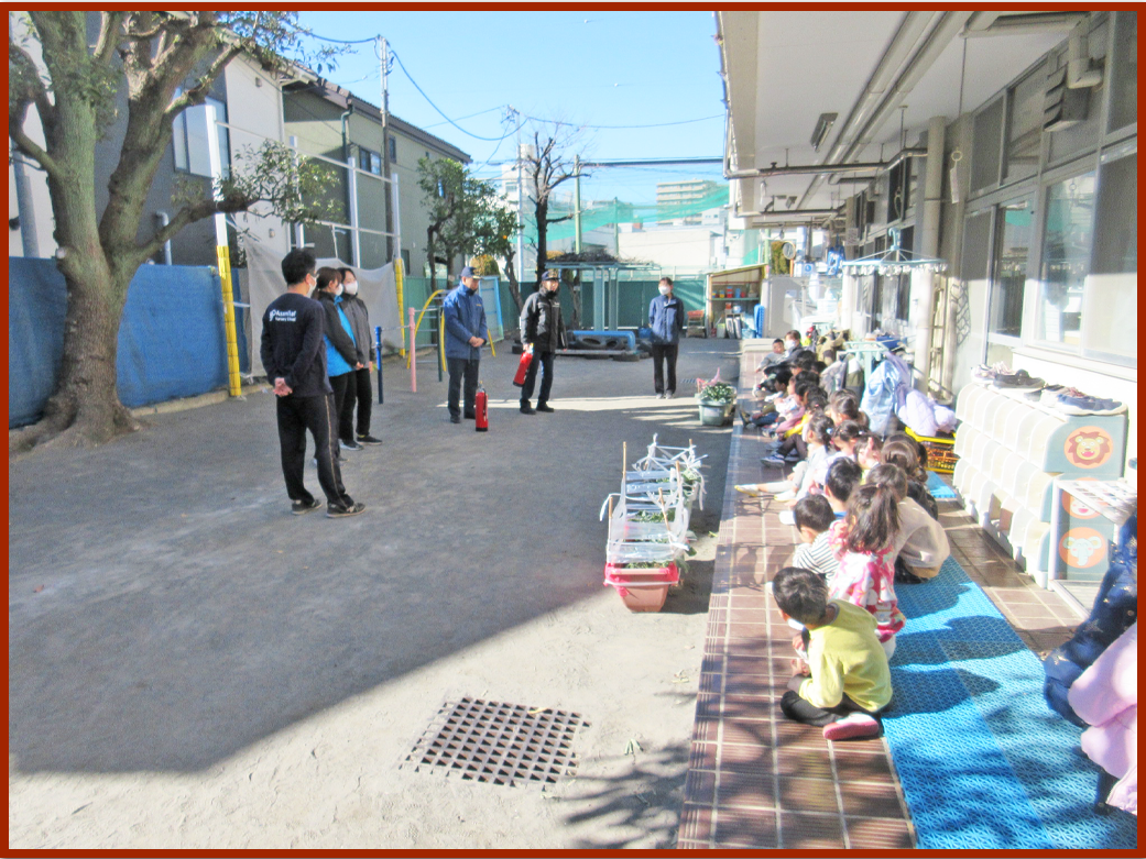 今日は、避難訓練後に園庭で消防士立ち合いの消火訓練を行いました。見学をしたたんぽぽ組、ひまわり組さんは、消防士さんの合図に合わせて「火事だ」と大きな声で知らせる事が出来ました。